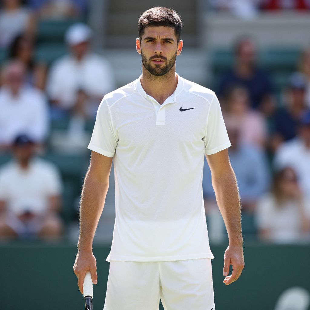 Photograph of a handsome, muscular man with short, dark hair and a trimmed beard, standing on a sunlit tennis court. He's wearing a white Nike polo shirt and matching shorts, holding a tennis racket in his right hand. The background is blurred with spectators in the stands. He has a focused, slightly serious expression, and the sunlight creates a soft glow around him.
