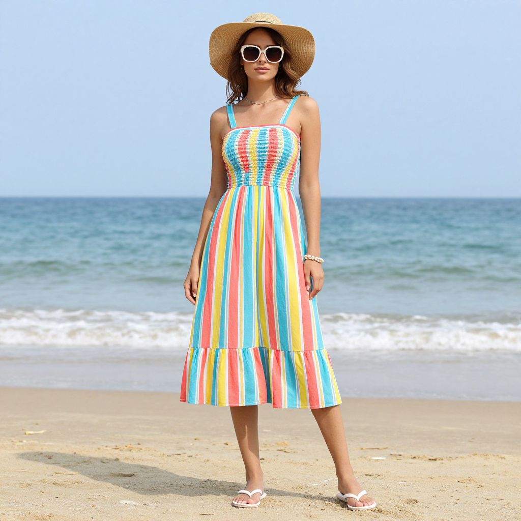 Full body shot, Petite woman, vibrant striped sundress, lightweight cotton fabric, sleeveless design, flared skirt, knee-length hem, cinched waist, playful ruffles, bright colors, ocean blue, sunny yellow, coral pink, paired with white flip-flops, woven straw sun hat, oversized sunglasses, beachy waves hairstyle, minimal jewelry, seashell bracelet, relaxed summer vibe Sexy. Pretty face and beаutiful eyes. Big breasts