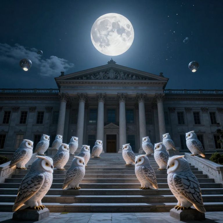 Photograph of a full moon illuminating a neoclassical building, with twelve glowing white owls sitting in a line on the steps, surrounded