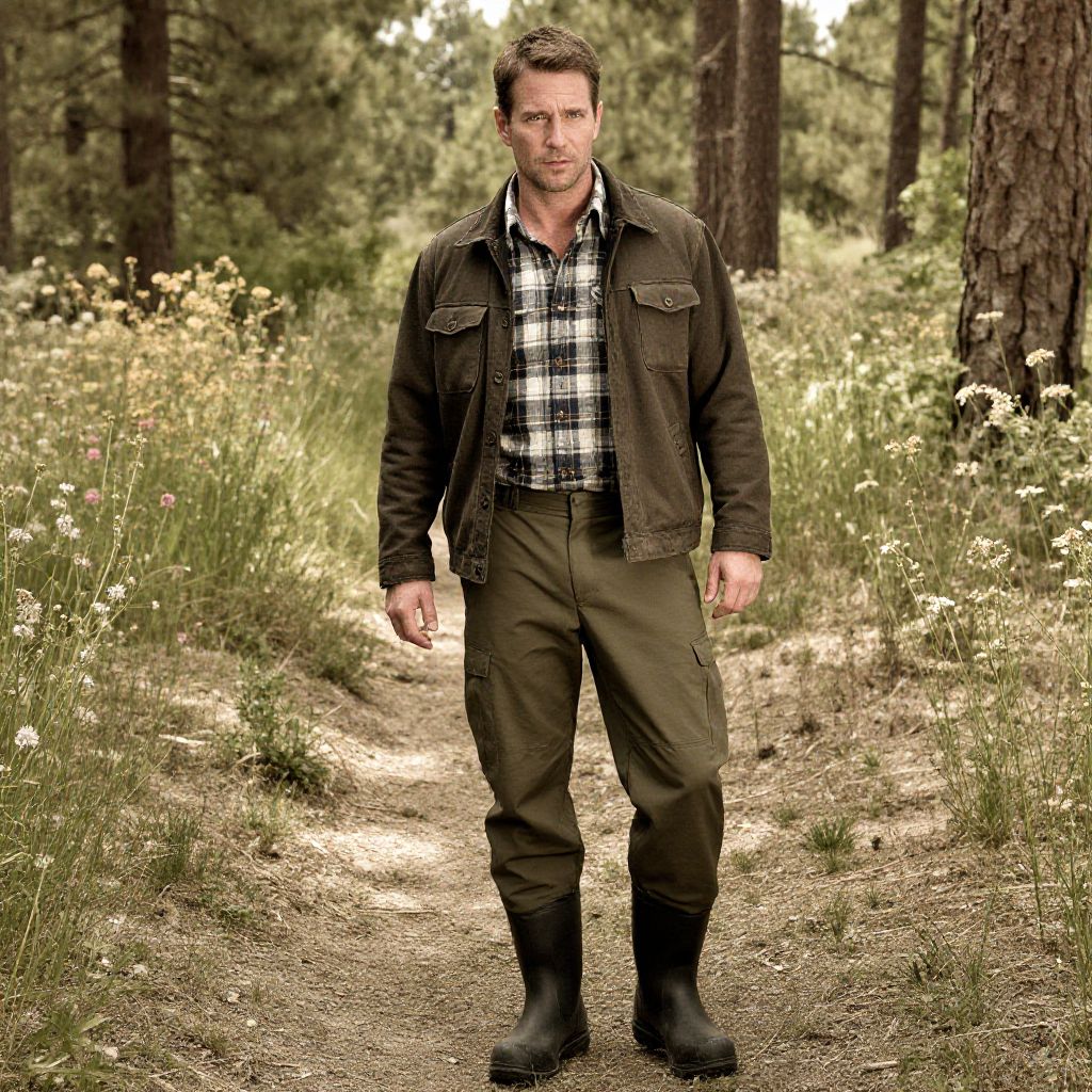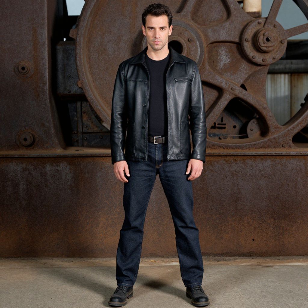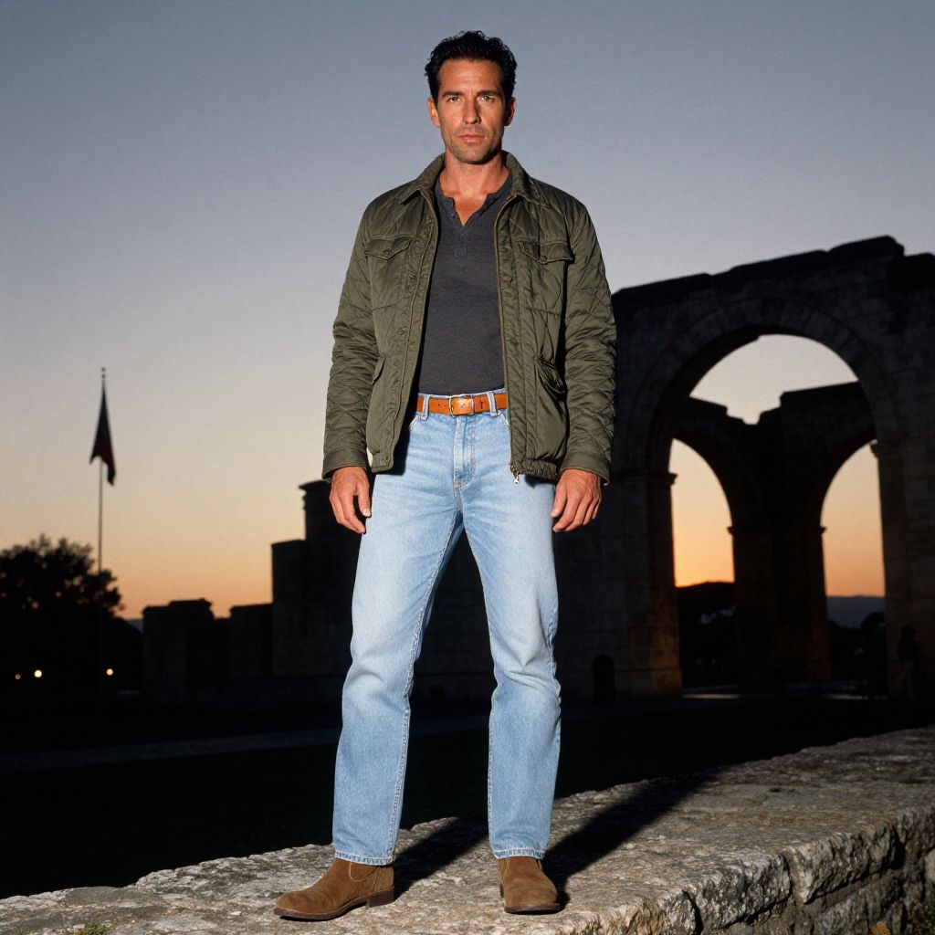 A man, burgundy leather bomber jacket, charcoal grey crew-neck sweater, distressed light blue jeans, brown suede desert boots, steep red sandstone formations, sparse desert vegetation, dramatic cloud shadows, eastman film stock, contemplative expression. Man has masculine face and piercing eyes