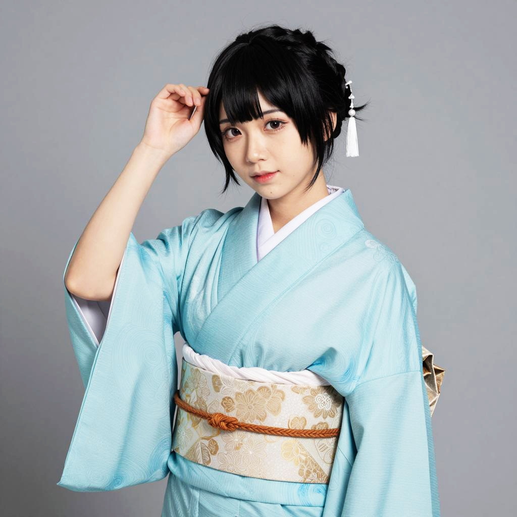 Portrait of an East Asian woman dressed in a realistic cosplay costume of Kanae Kocho from the anime Demon Slayer. She wears a traditional-style light blue kimono with subtle swirling patterns, a cream and gold floral obi tied with a brown cord, and a white hair accessory with tassels. The woman poses gracefully against a plain gray background, highlighting the intricate details of the kimono and traditional hairstyle.