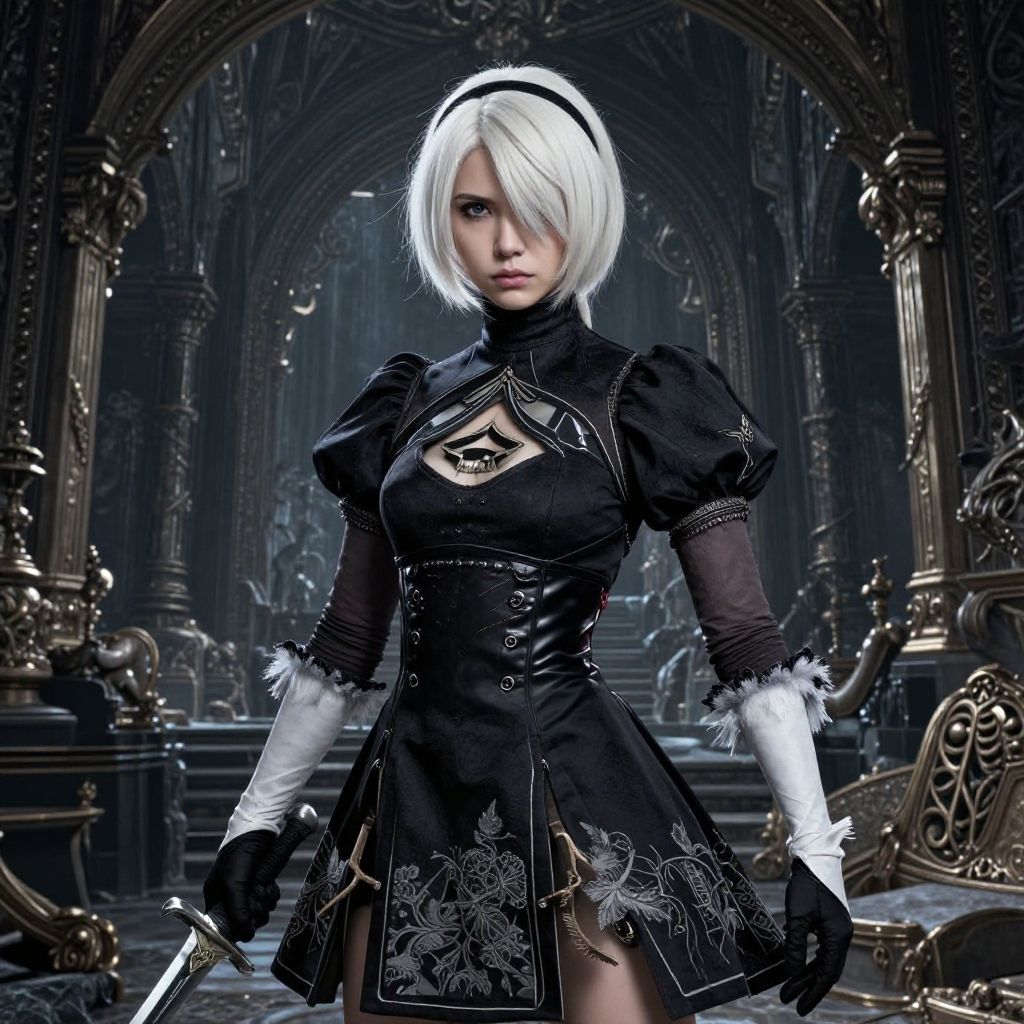 This is a highly detailed CGI image of a white-haired, blue-eyed woman in a gothic, black, puffy-sleeved dress with intricate silver embroidery and a keyhole neckline. She wears white gloves and a black headband. The background features an opulent, dark Gothic cathedral with ornate arches, gold-accented pillars, and a grand staircase. The woman's expression is serious, and she stands confidently, holding a small, ornate dagger. The overall style is a blend of Victorian and cyberpunk, with a dark, moody color palette and a focus on intricate textures and details.