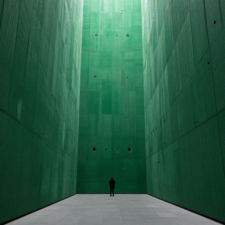 Silent corridors stretch endlessly, flanked by towering walls of textured green panels and diamond-shaped voids, as a solitary figure stands at the center, dwarfed by the oppressive architecture that looms above and around them.