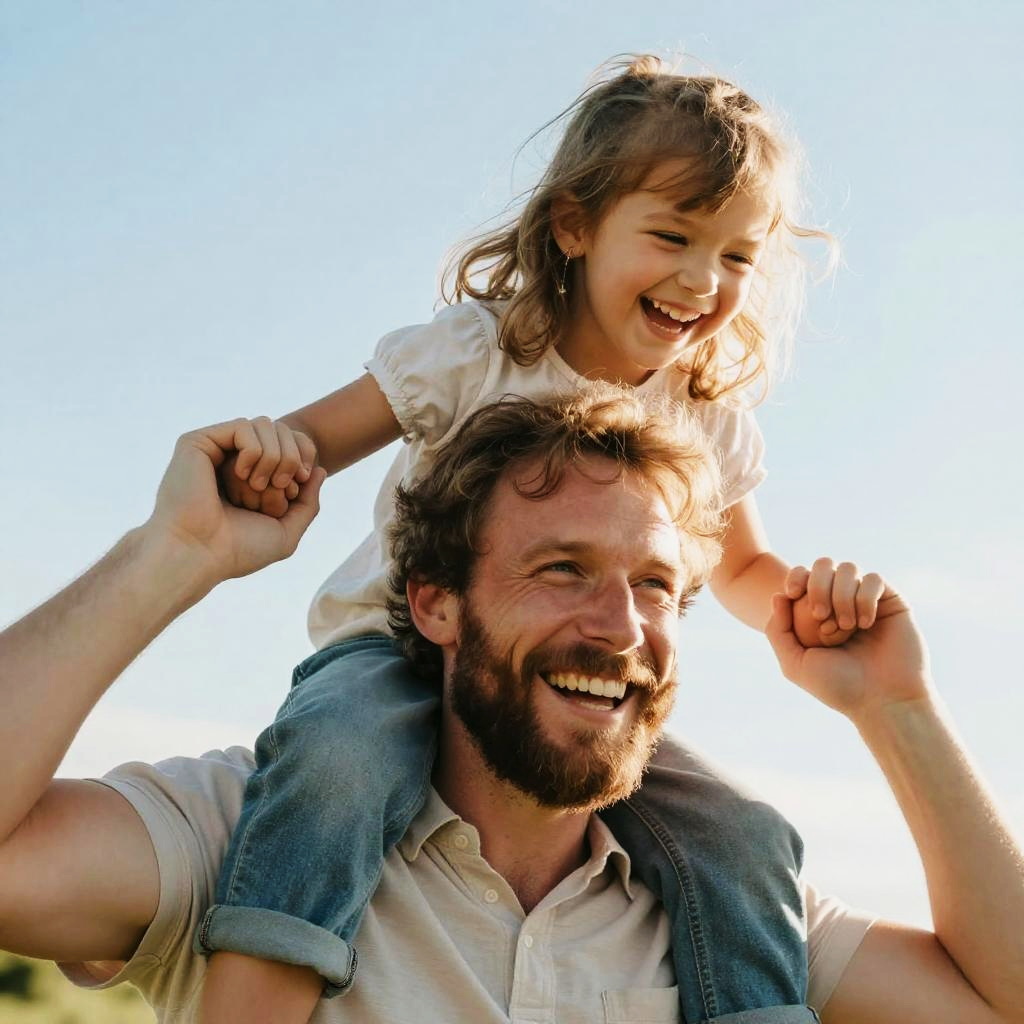 A happy family indoors in a cozy living room, a woman hugging a man from behind while a child is playfully leaning on the man’s shoulder, warm sunlight streaming through large windows, natural lighting with soft shadows, warm orange and brown tones creating a friendly and loving atmosphere, casual modern home interior