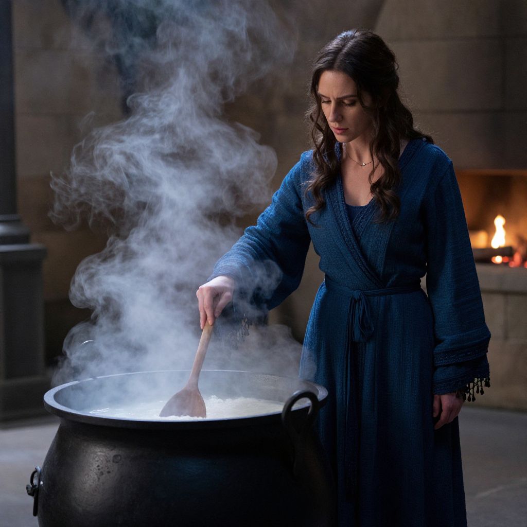 Woman in a deep blue robe stands attentively beside a large, black cauldron emitting thick, billowing steam, her hand holding a wooden spoon poised above the bubbling contents, set against a backdrop of stone architecture and flickering firelight.