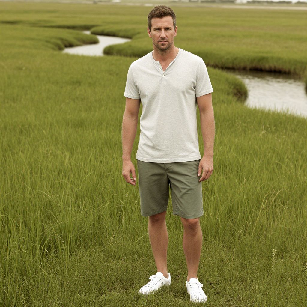 A man, light blue cotton popover shirt, khaki utility shorts, white canvas sneakers, woven leather belt, casual summer vibe, tranquil lake, wooden observation deck, colorful migratory birds, soft focus, warm sunlight, relaxed smile. Man has masculine face and piercing eyes