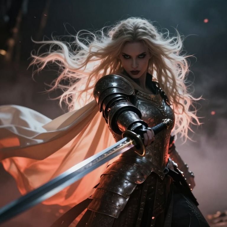 Realistic high Quality analog Photo, atmospheric lighting, volumetric lighting, extreme hkevil face closeup movie portrait, FredFraiStyle long haired shrouded Silhouette of a buxom charming evil Knightess with towering billowing Hair and bleaked orange White Cape, Standing Battle ready with powerful thin Long sword, pastel Red beige Gradient, Highly detailed photorealistic close-up action scene of a knight in intricately patterned armor, The focus is on the knight’s sword, showcasing the deep black of light that trails with the swift motion of the weapon, capturing the dynamic speed of the fighter, The scene is set in a misty, fog-filled night with a vibrant color palette with deep blacks, The background is hazy, while motion streaks and dynamic lighting enhance the sense of speed and intensity, with the knight’s glow piercing through the mist