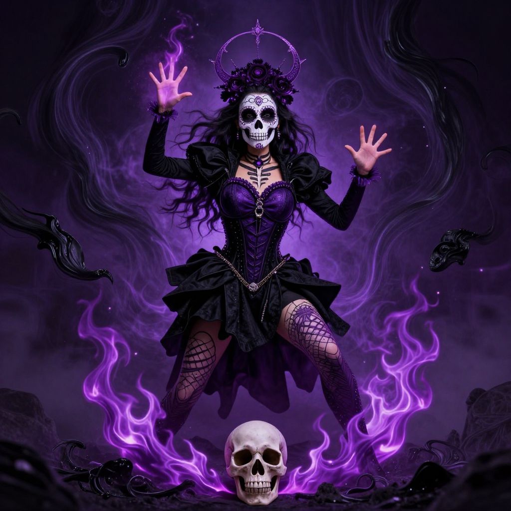 A sugar skull woman in a black and purple outfit casts a black magic spell, surrounded by swirling black and purple flames, with a skull at her feet.
