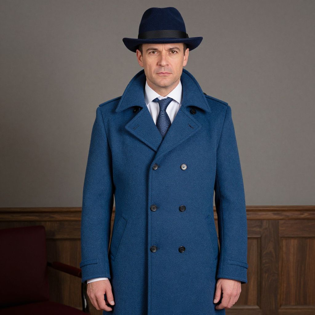Photograph of a middle-aged Caucasian man standing against a plain gray wall with wooden wainscoting. He has fair skin, short light brown hair, and is wearing a dark blue, double-breasted overcoat with large black buttons. Underneath, he has a white dress shirt and a dark blue tie. He also wears a matching dark blue fedora hat. His expression is neutral, and he is facing the camera directly. The lighting is even, highlighting the texture of his coat and the wood paneling behind him. The overall style is formal and slightly vintage.