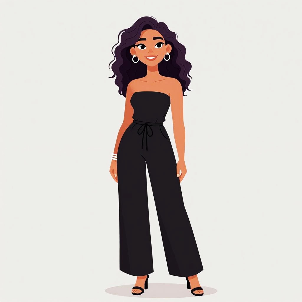 Cartoon-style illustration of a confident woman with black bob hair, wearing a black and white patterned jumpsuit with red accents, red belt, and
