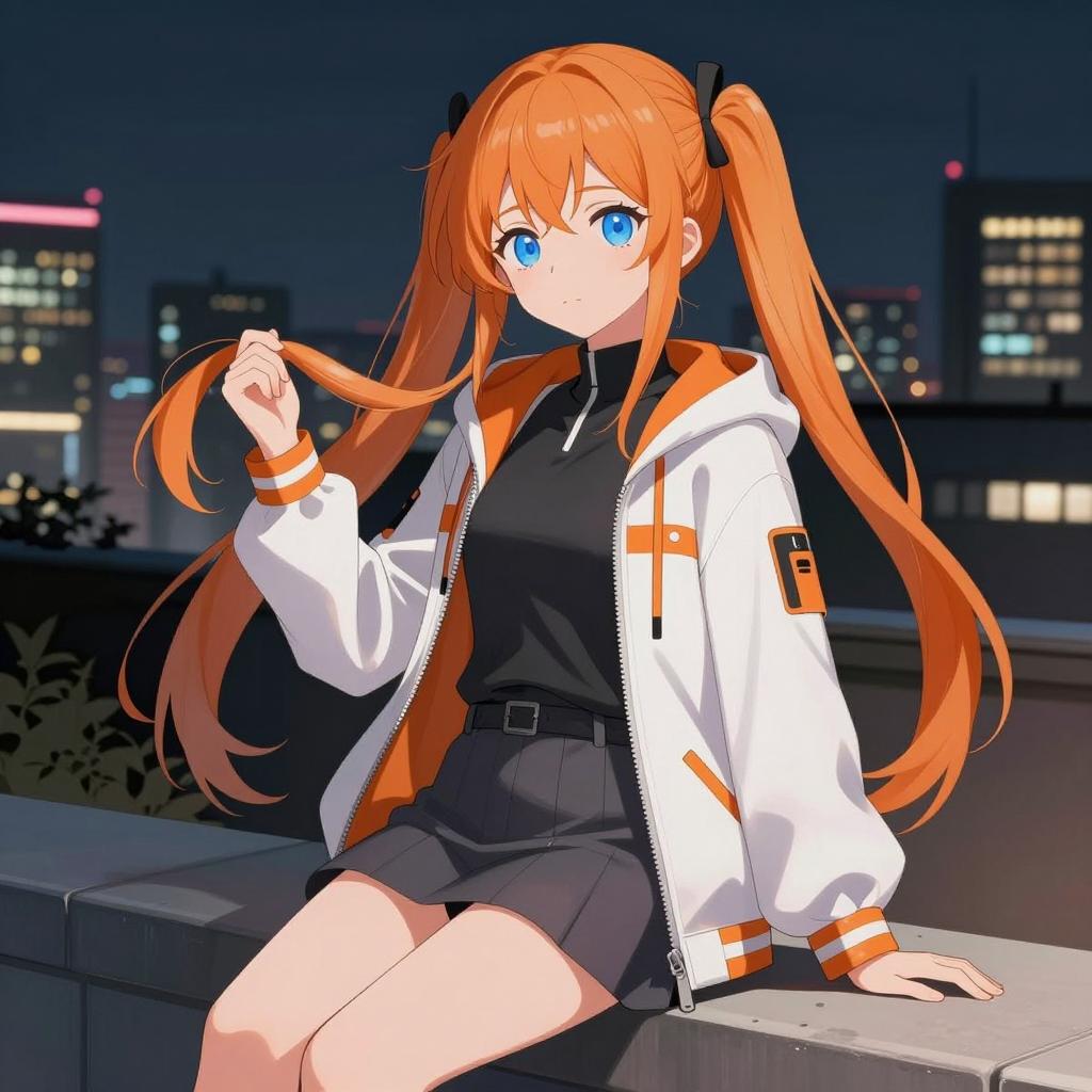 Illustration of an anime girl with long orange twin-tails sitting on a ledge at night. She wears a white jacket with orange accents, a black top, and a gray skirt. The background features a city skyline with illuminated buildings under a dark blue night sky. The character has bright blue eyes and a confident expression, holding her hair playfully.