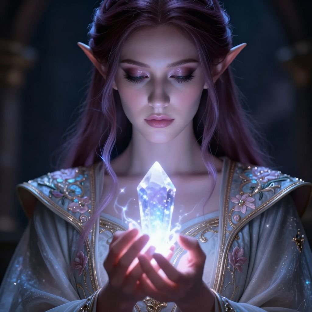 Close-up of an eladrin female mage holding a glowing arcane crystal, her ethereal skin subtly illuminated by the spell, wearing detailed enchanted robes with floral patterns and fine embroidery, her serene expression framed by soft luminescent tendrils of magic.