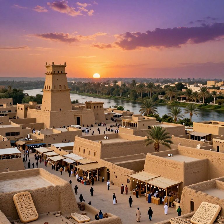 Mesopotamia ancient cityscape at dusk, detailed ziggurats and mudbrick buildings under a vibrant sunset, people in traditional attire bustling in market streets, lush riverside with palm trees, cuneiform tablets scattered around, hyperrealistic style, warm tones