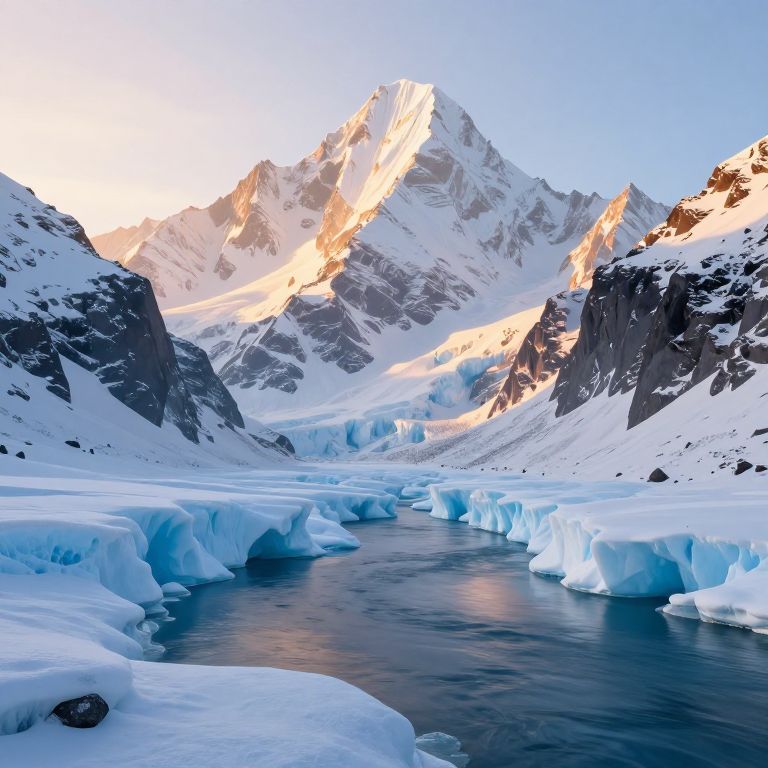 A stunning 3D-rendered landscape showcases towering mountains cloaked in pristine snow and ice, their rugged peaks bathed in the soft glow of golden-hour sunlight, casting a serene ambiance over a tranquil river below, where icy formations seem to defy gravity, creating an ethereal and harmonious visual symphony.