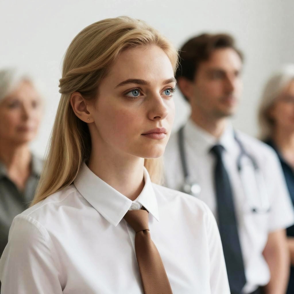 Woman with long brown hair, wearing white shirt and light blue cardigan, standing in pharmacy, holding magazine, looking down. Shelves filled with various medicines and products in background. Stacks of magazines on counter to her left. Intense focused expression.