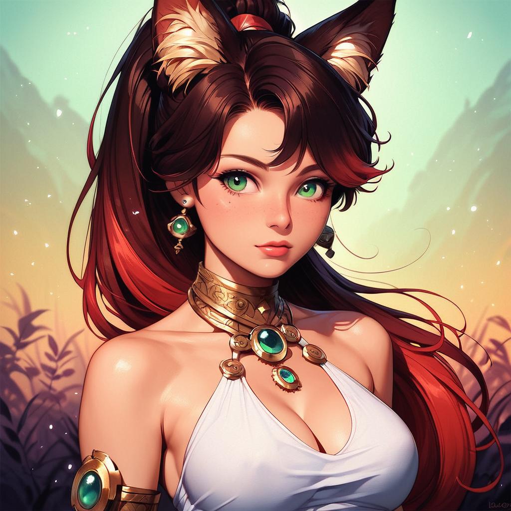 1girl, solo, fox girl, animal ears, fox ears, fox tail, green eyes, large breasts, red hair, brown hair, multicolored hair, ponytail, gradient hair, long hair, halterneck, cowboy shot, whimsical_meadow, steampunk_gear, retro_pixelated, alluring
