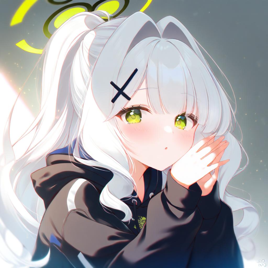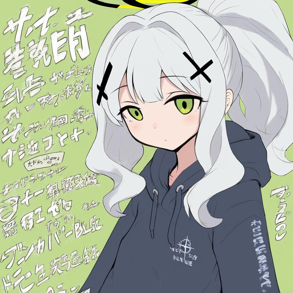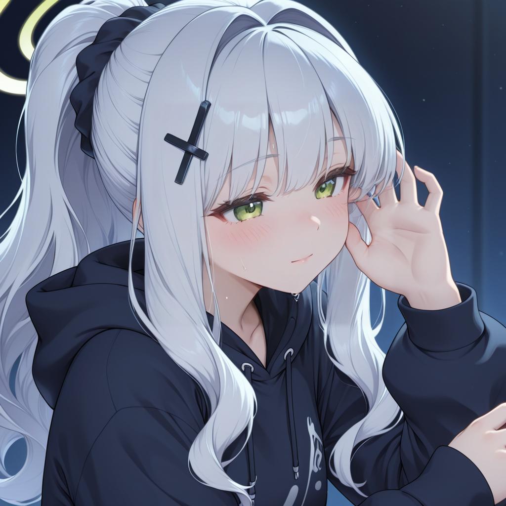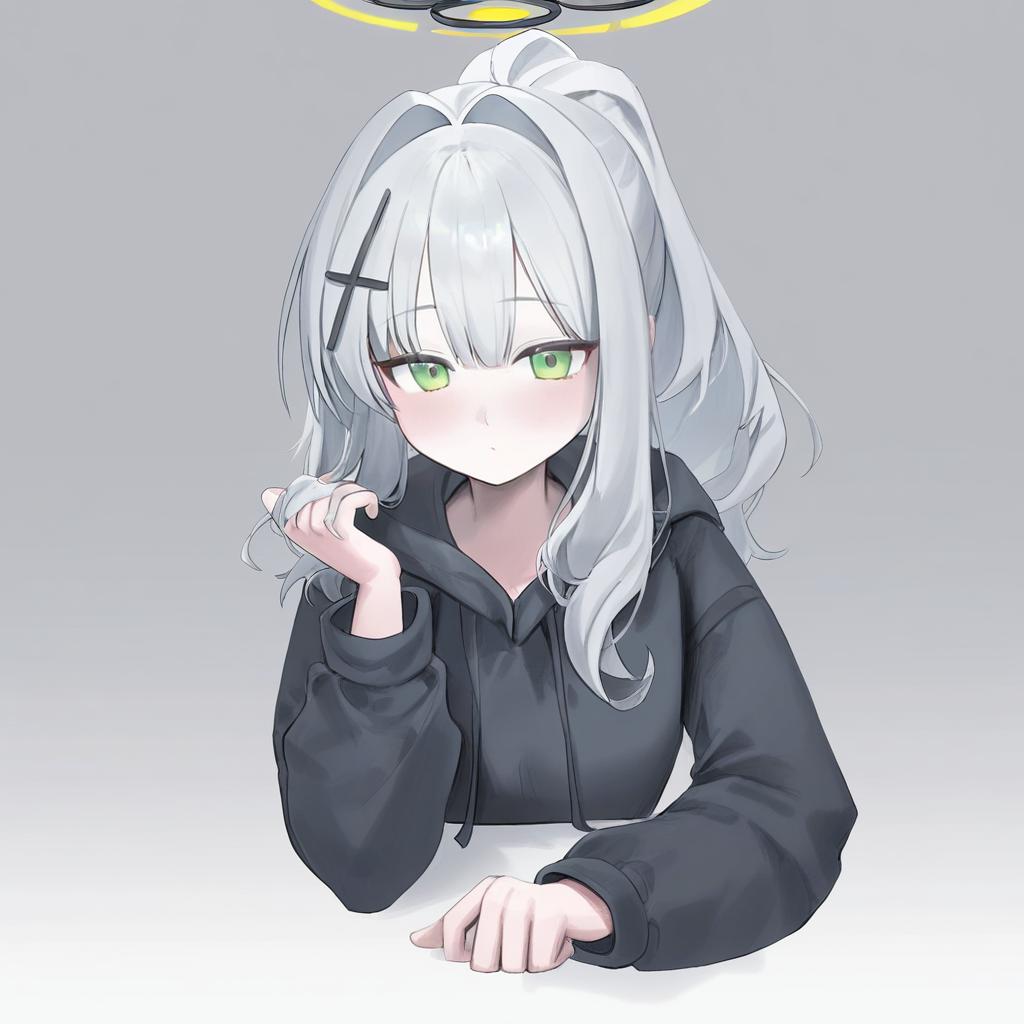 Hare (blue archive), blue archive, 1girl, green eyes, long hair, grey hair, white hair, cross hair ornament, ponytail, hair intakes, black hoodie, halo, long sleeves, hood down, by artist freng, leet