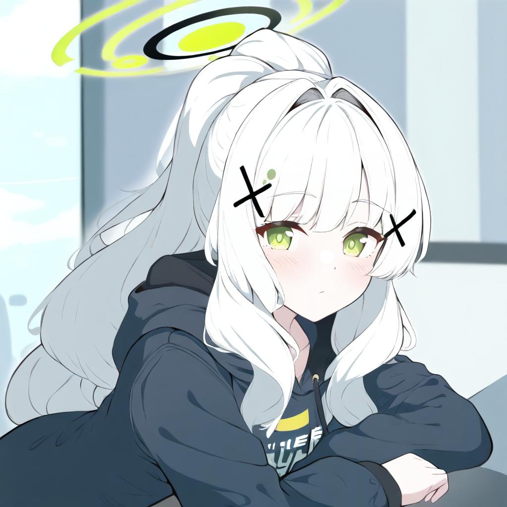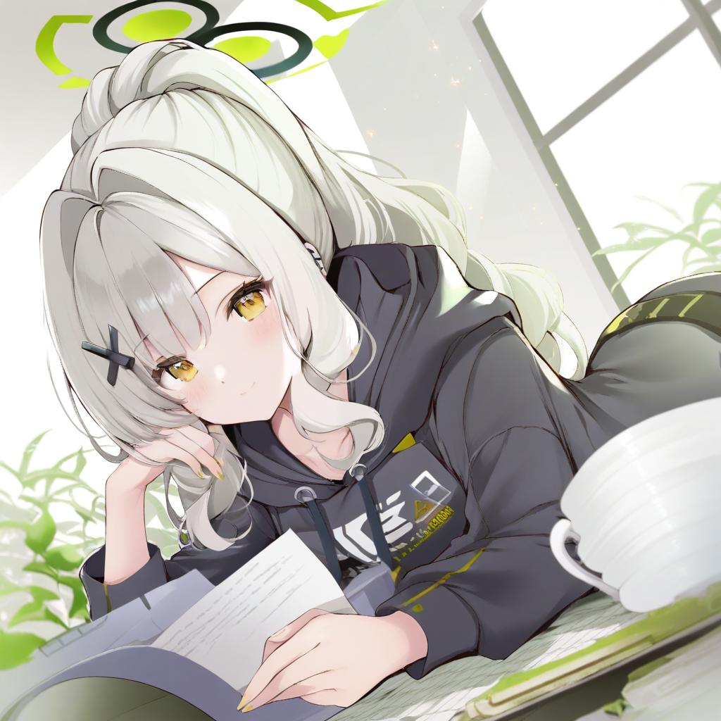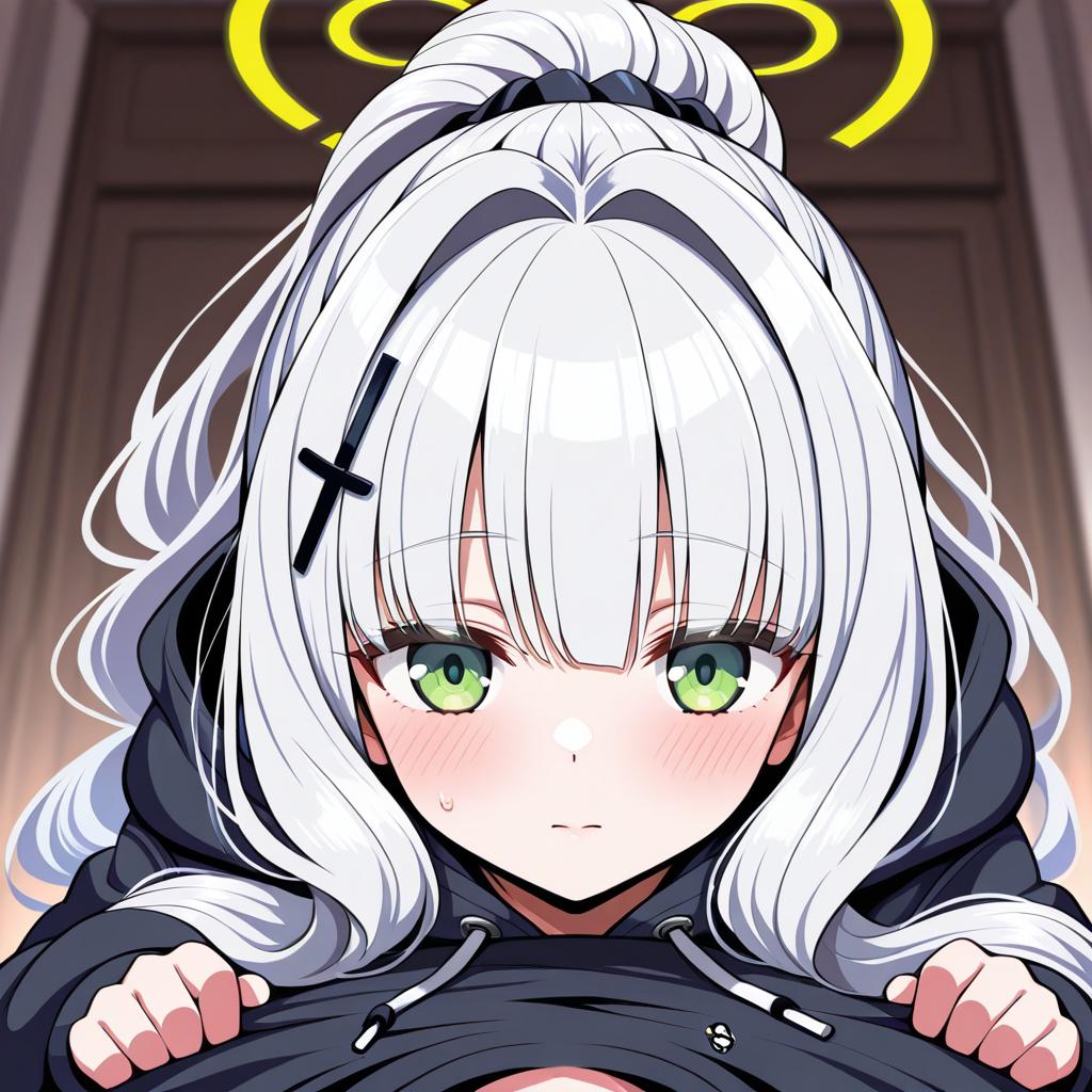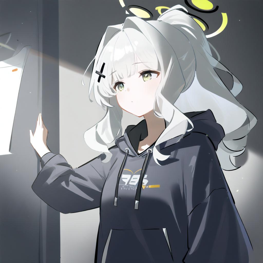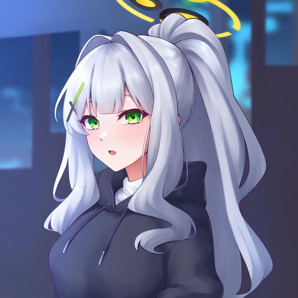 Hare (blue archive), blue archive, 1girl, green eyes, long hair, grey hair, white hair, cross hair ornament, ponytail, hair intakes, black hoodie, halo, long sleeves, hood down, by artist freng, leet