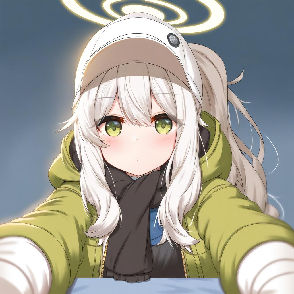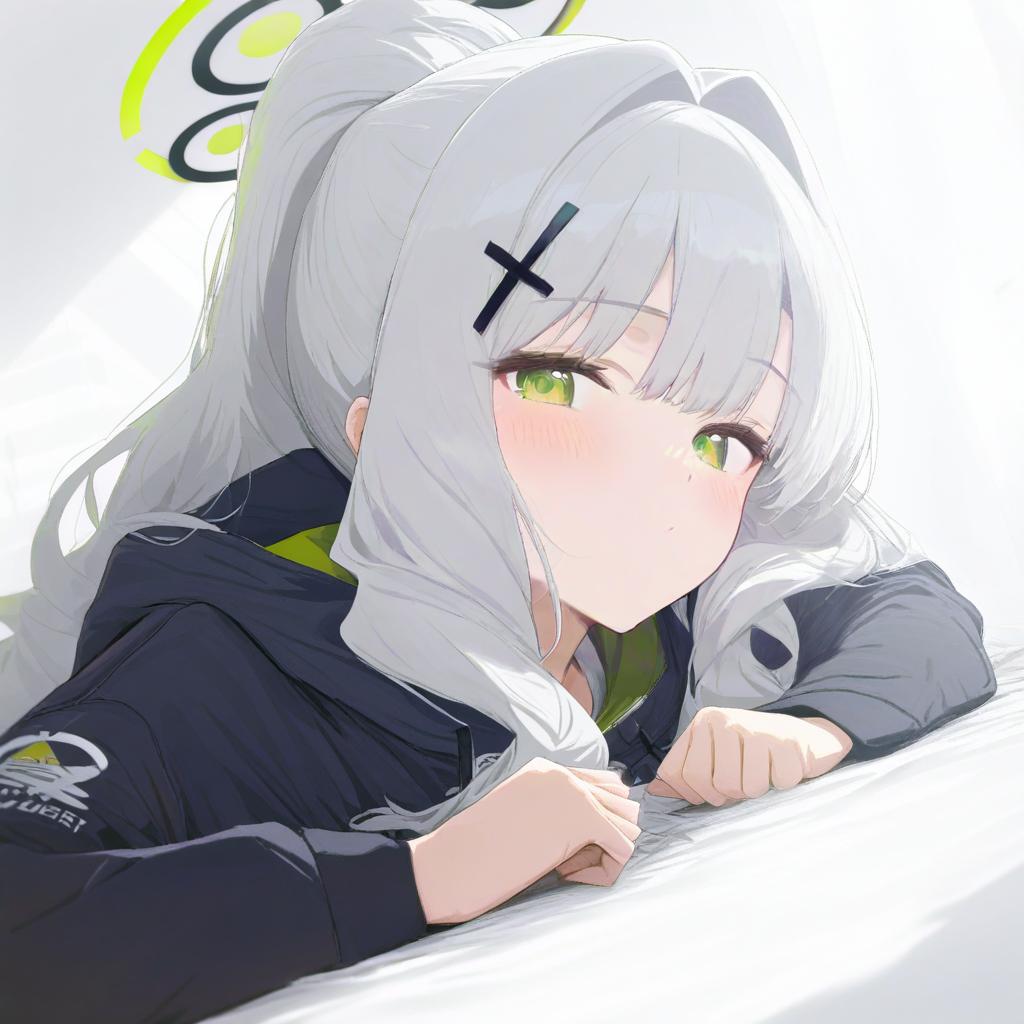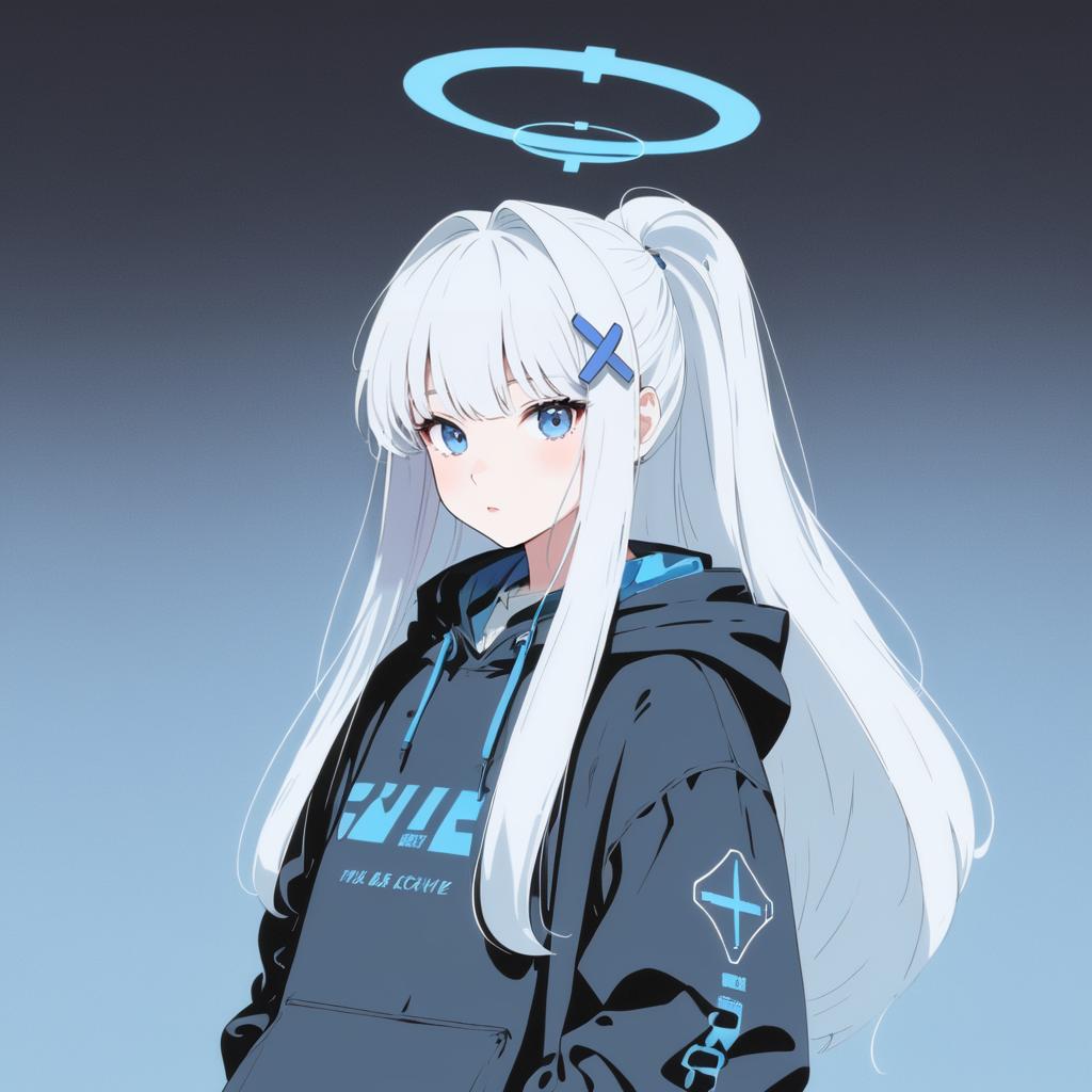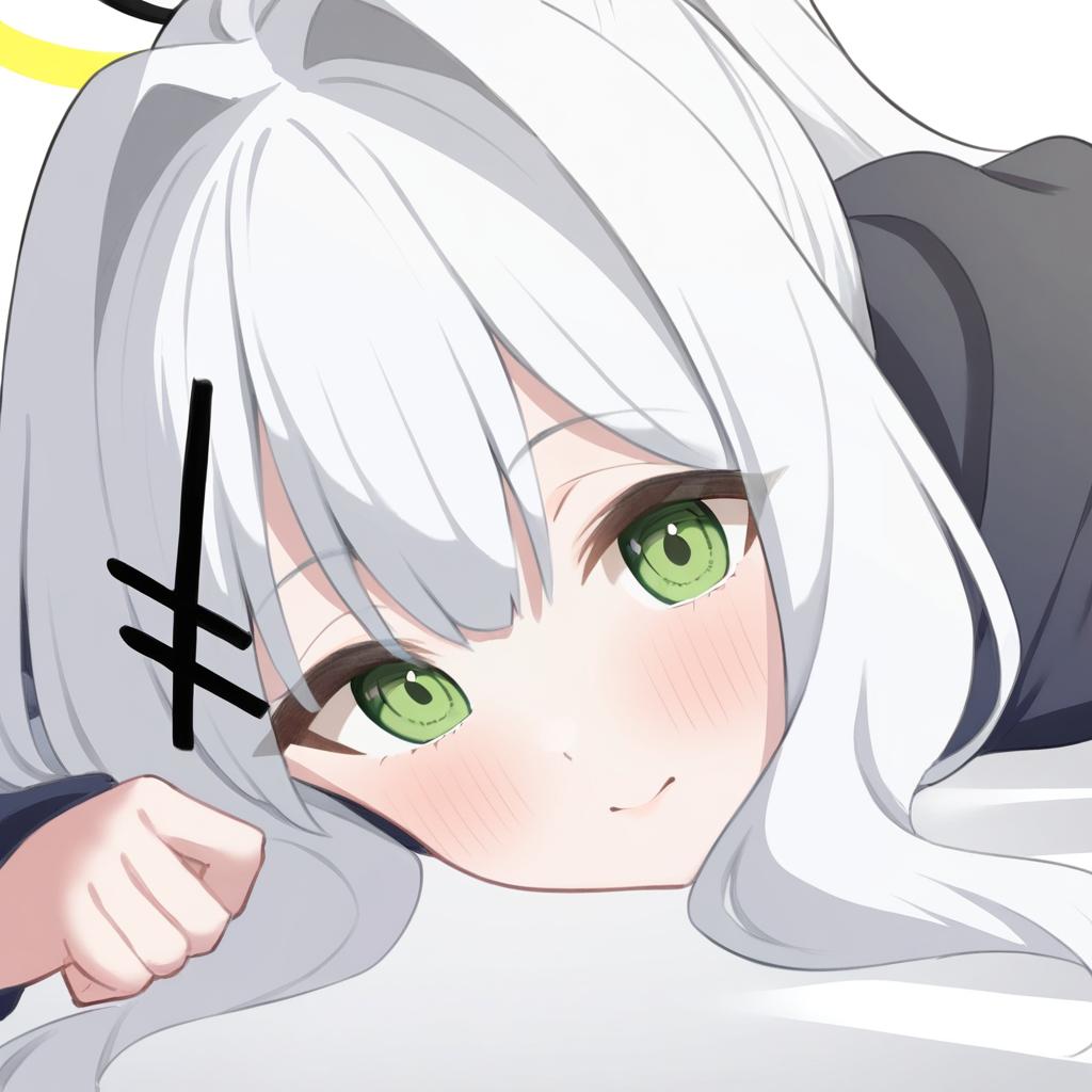 Hare (blue archive), blue archive, 1girl, green eyes, long hair, grey hair, white hair, cross hair ornament, ponytail, hair intakes, black hoodie, halo, long sleeves, hood down, by artist freng, leet