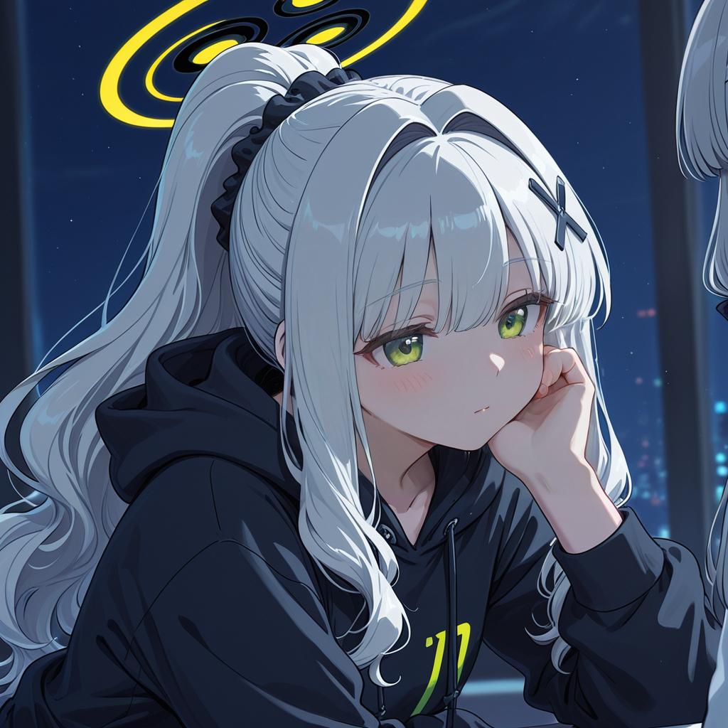 Digital illustration of an anime-style girl with long grey hair tied in a ponytail, green eyes, and wearing a black hoodie with long sleeves. She has a cross hair ornament and a glowing halo above her head, sitting with her hand near her face against a simple grey background.