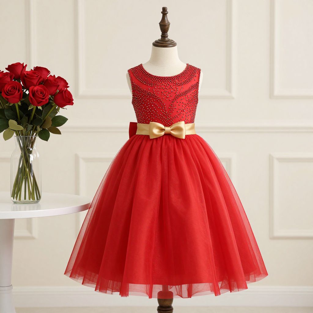 Elegant red flower girl dress displayed on a mannequin, featuring a beaded bodice, flowing tulle skirt, and a golden bow sash, complemented by a vase of vibrant red roses on a nearby white table.