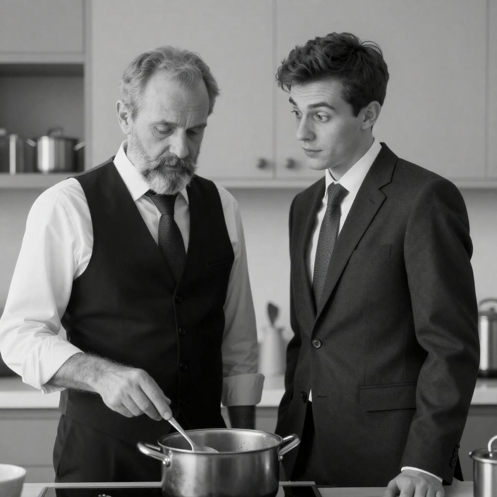 Black-and-white photograph of two men in a kitchen. The older man with a beard, wearing a white shirt, black vest, and tie, stirs a pot with a spoon. The younger man, in a dark suit and tie, looks at him with a curious expression. Background includes kitchen utensils and a blurred cabinet.
