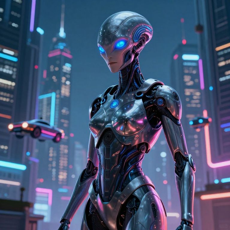 Lucaeio, futuristic cybernetic warrior with sleek metallic armor and neon blue accents, standing in a dark cityscape illuminated by holographic billboards, intense gaze, high-tech sci-fi environment, dynamic pose.