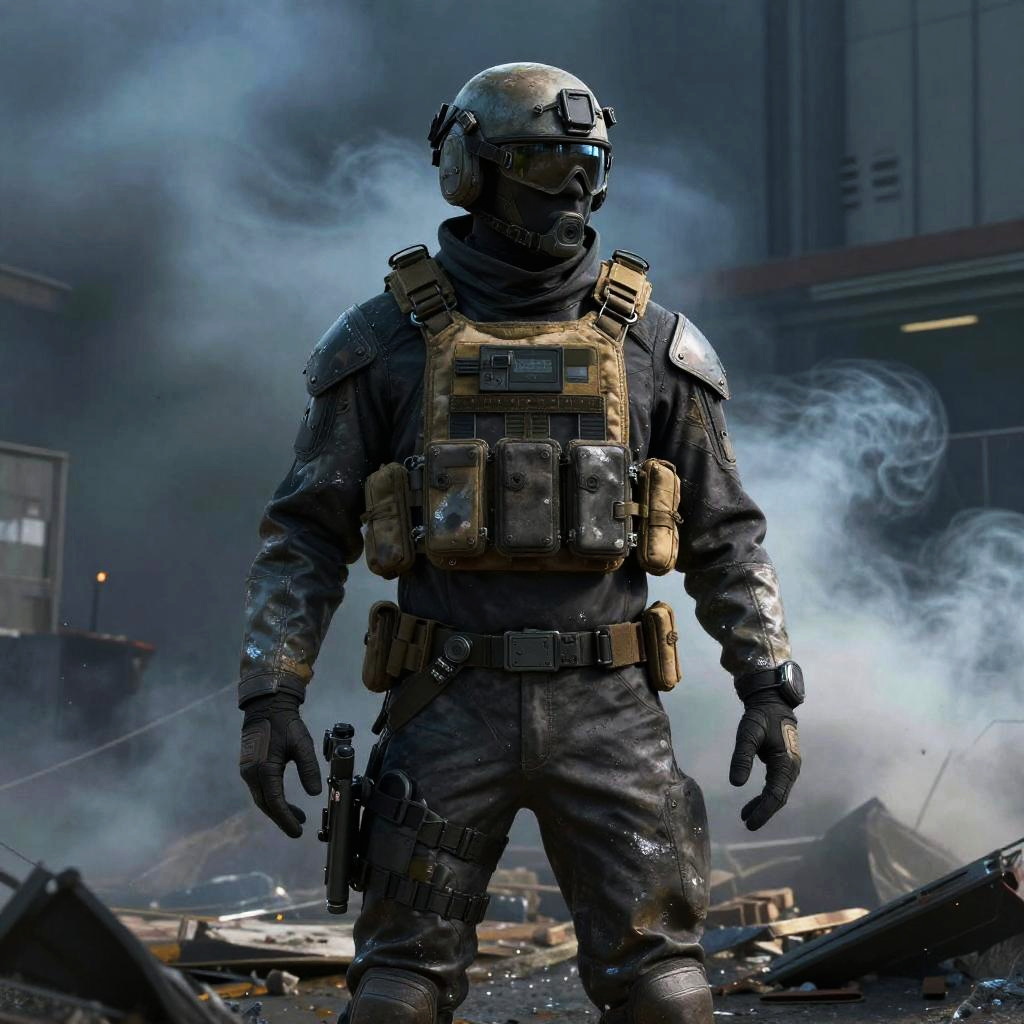 Usec Tarkov soldier in futuristic tactical combat gear, standing in a war-torn urban environment with vivid smoke and debris, intense blue and grey color palette, hyper-detailed textures, cinematic lighting, gritty atmosphere, post-apocalyptic realism