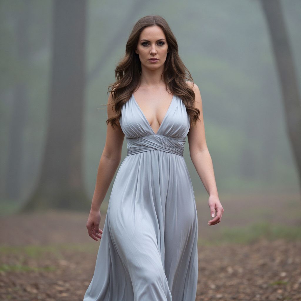Photograph of a confident woman with long, wavy brown hair walking through a misty forest. She's wearing a flowing, silver-gray dress with a deep V-neck, revealing her cleavage. The dress has a cinched waist and billows slightly as she moves. Her skin is fair, and she has a serious expression. The background is softly blurred, with tall trees and a foggy atmosphere.