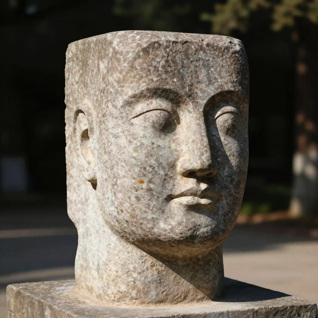 Square head meaning portrayed as a symbolic statue with a sharp-edged square head, carved from stone to represent steadfastness and stability, placed in a serene outdoor setting with dramatic lighting to highlight textures.