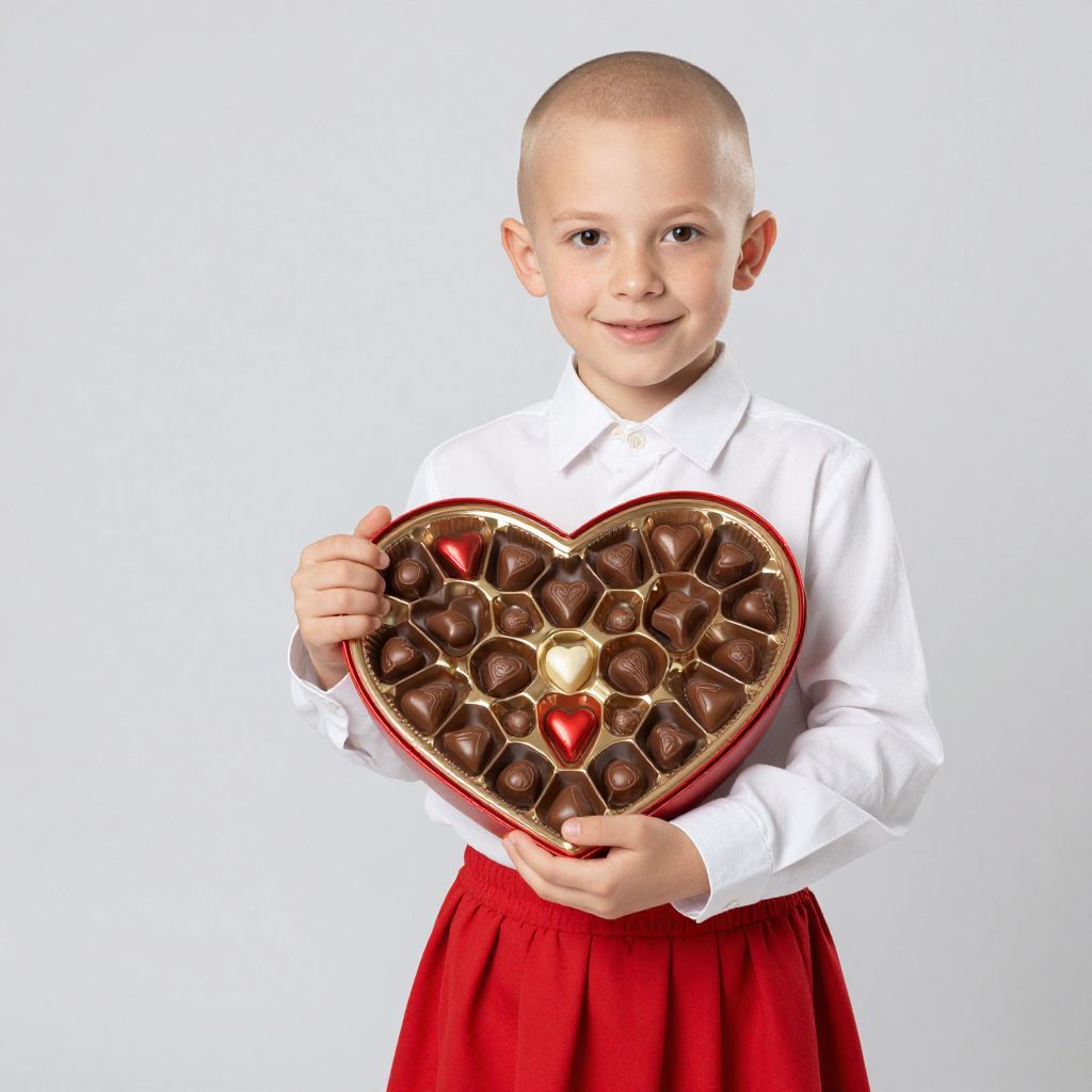 Photograph of a young, bald Caucasian boy with light skin, wearing a white long-sleeve shirt and a red skirt, standing against a plain white background. He is holding a heart-shaped chocolate box with 12 assorted chocolates and a single red chocolate heart in the center. The boy has a slight smile on his face and is looking directly at the camera. The image is brightly lit, with a focus on the boy and the chocolate box, highlighting the rich colors and textures of the chocolates and his clothing.