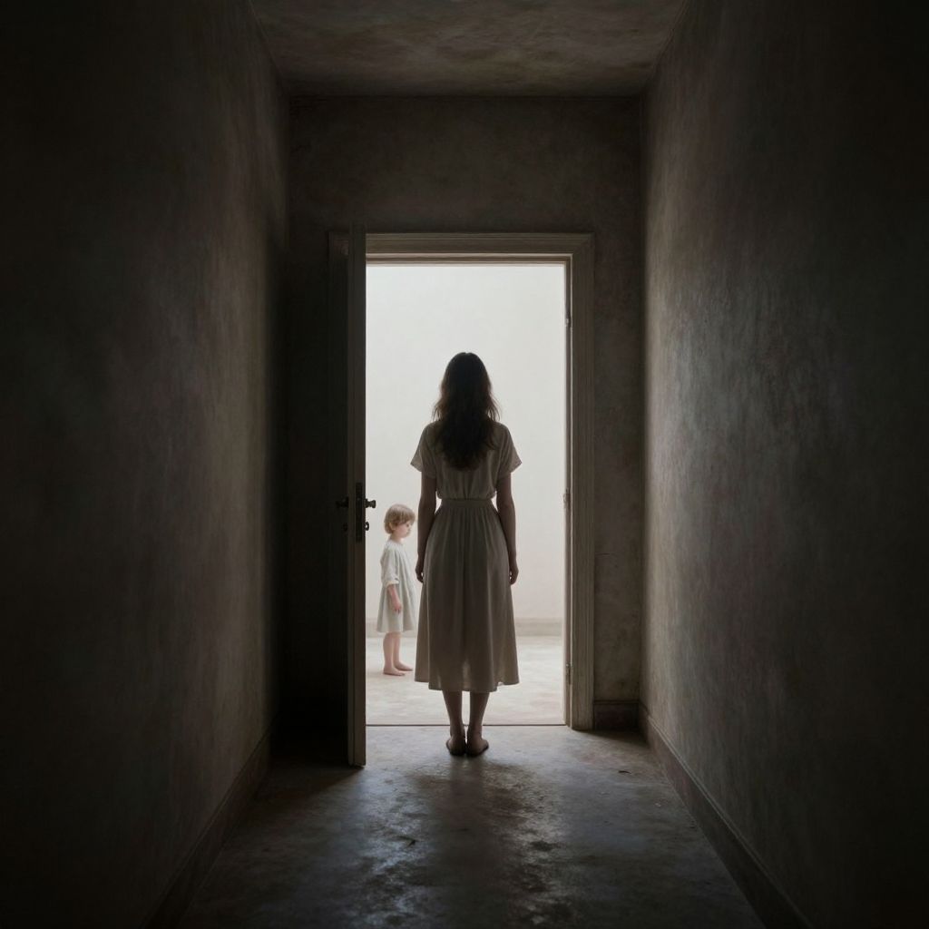 In a hauntingly surreal corridor, a woman stands at the threshold of a radiant doorway, where the light spills into a timeless realm, revealing a child who seems both familiar and enigmatic, defying the boundaries of past, present, and future.