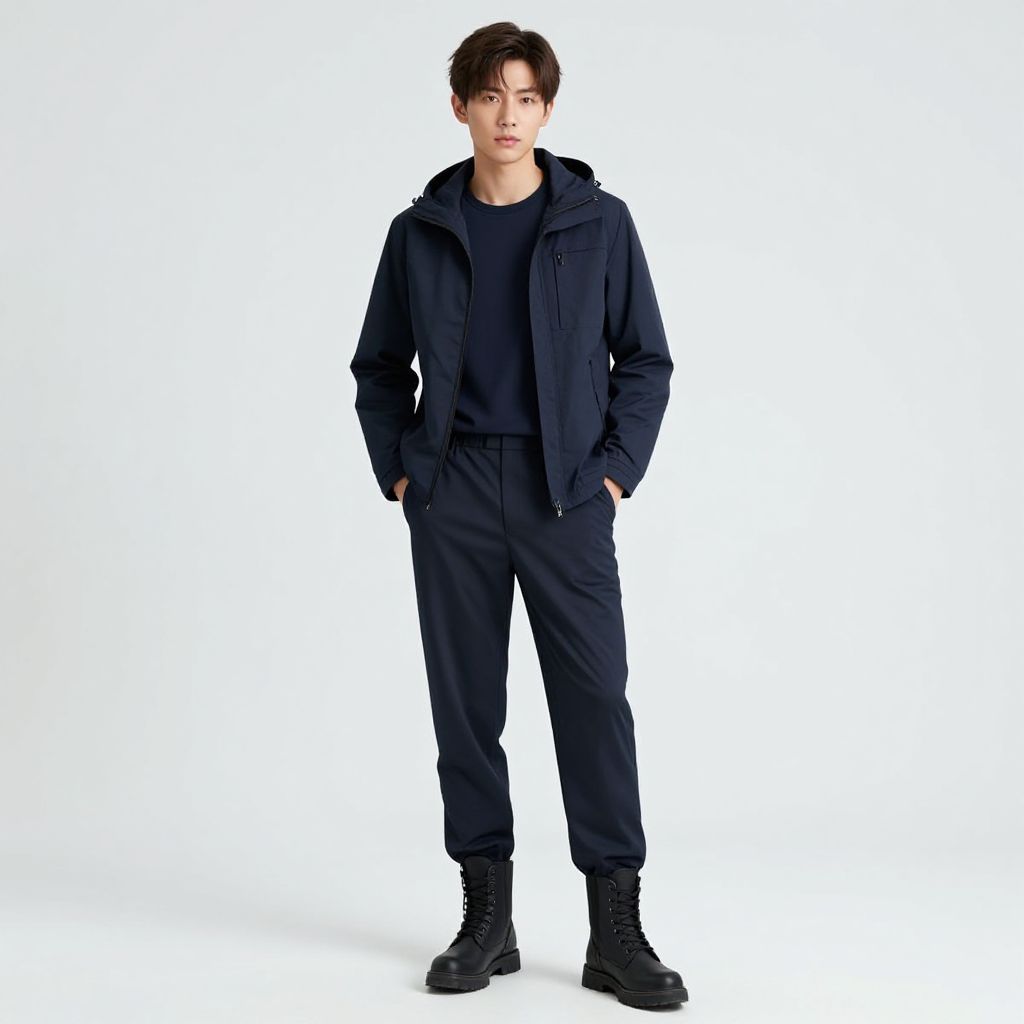 Photograph of a young Asian man with short black hair, wearing a navy hoodie, jacket, pants, and black boots, standing against a white background