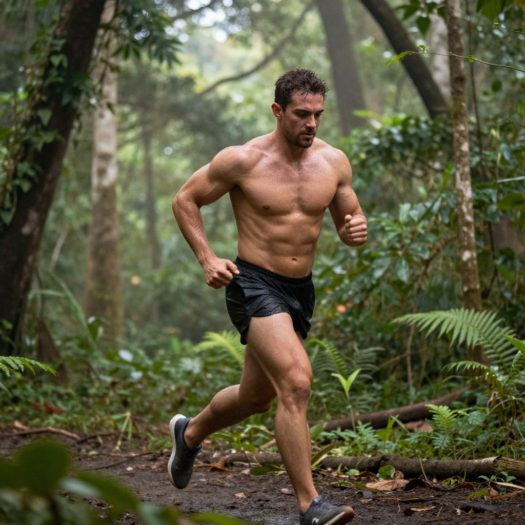 Photograph of a muscular, shirtless man with short dark hair jogging in a dense, green forest, wearing black shorts and gray sneakers.