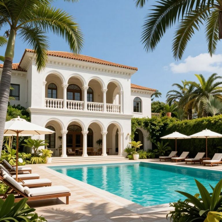 Lush tropical landscaping frames a luxurious Venetian-style mansion with arched balconies and columns, overlooking a vibrant turquoise pool surrounded by sun loungers and umbrellas under a clear blue sky.