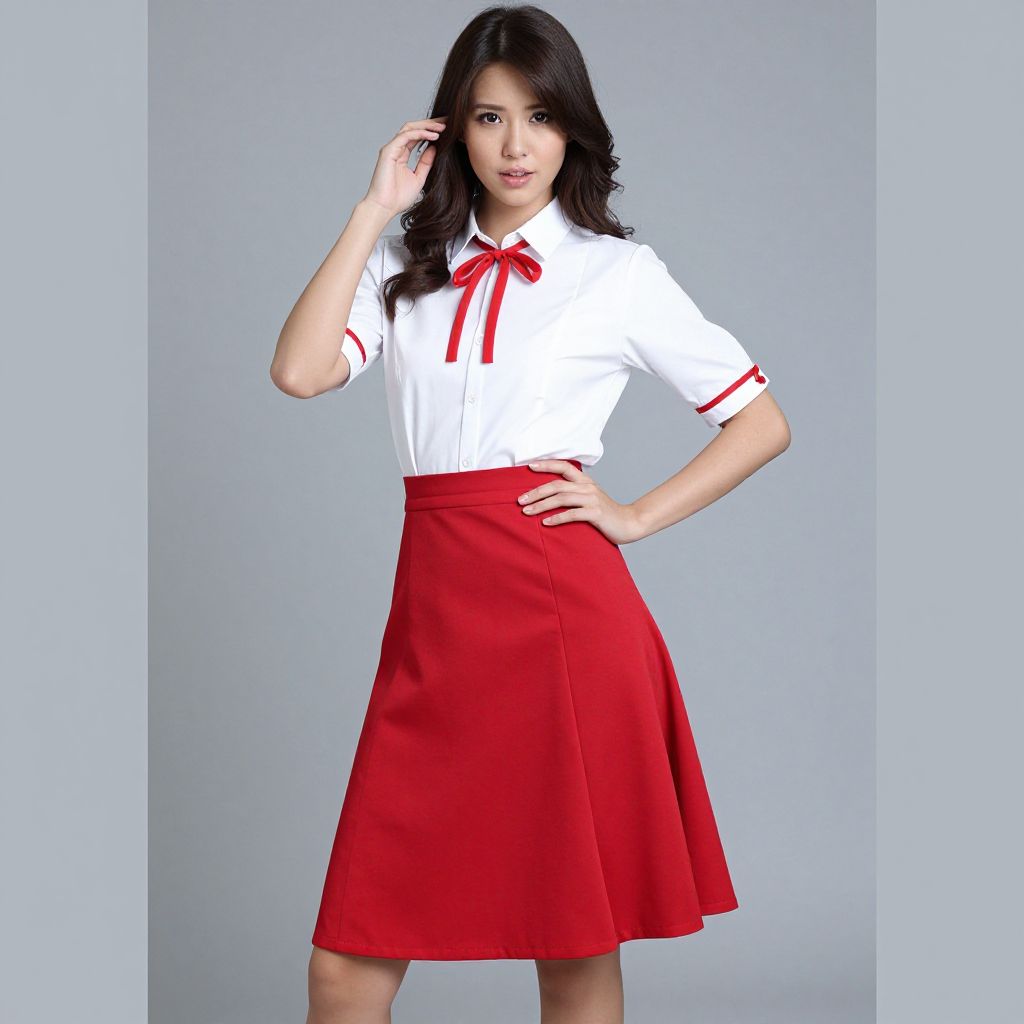 Photograph of an Asian woman with long, wavy black hair, standing against a plain gray background. She wears a white short-sleeved blouse with red ribbon accents and a red high-waisted A-line skirt. Her right hand is raised to her head, and her left hand rests on her hip. The blouse contrasts with the bright red skirt, creating a schoolgirl-inspired outfit. She has a neutral expression and a slender, petite build. The image is well-lit, emphasizing the crispness of the colors and textures.