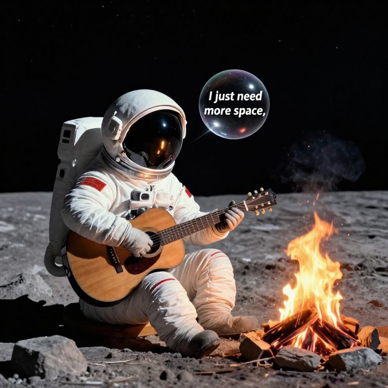 Photograph of an astronaut in white suit with reflective helmet, playing guitar by a campfire on the moon, speech bubble reads "I just need more