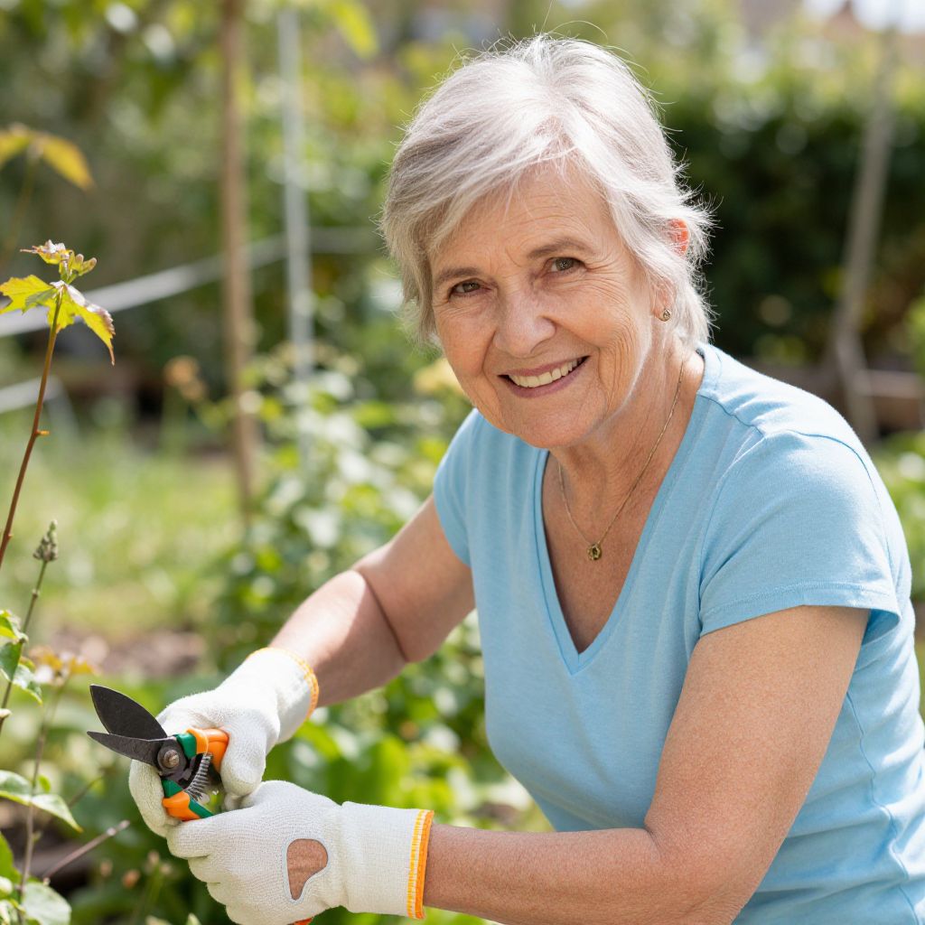 Photograph of an elderly woman with short gray hair, wearing a light blue shirt and white gardening gloves, smiling while pruning a plant in a sunny,