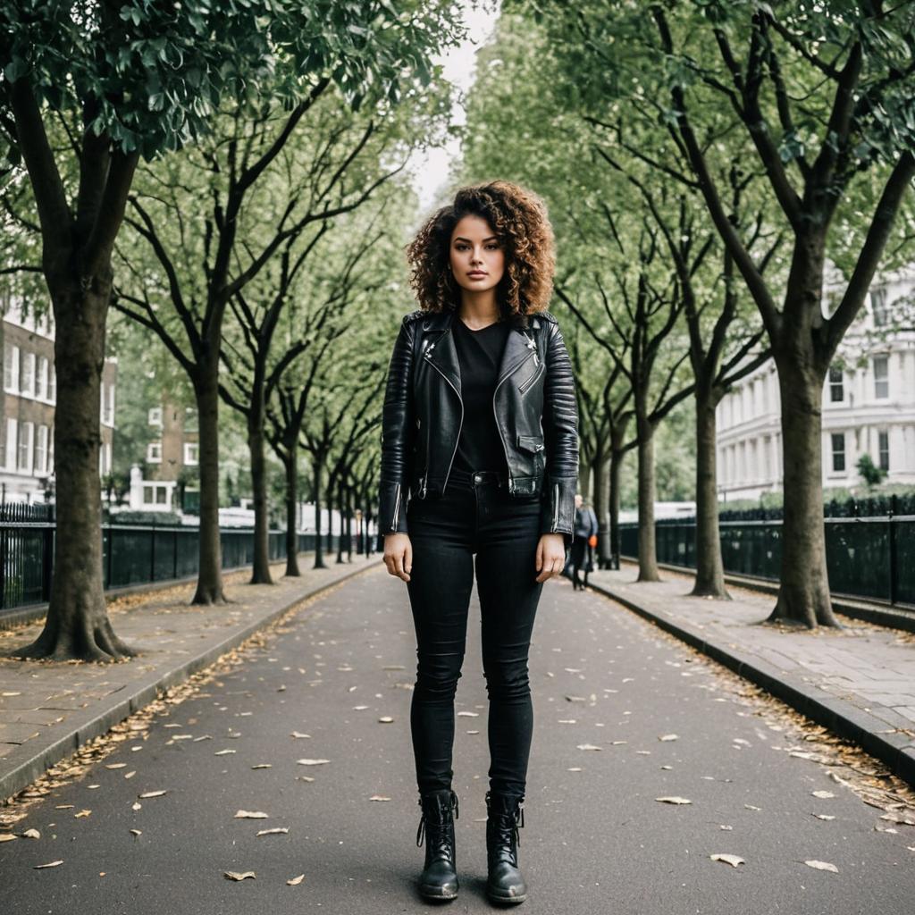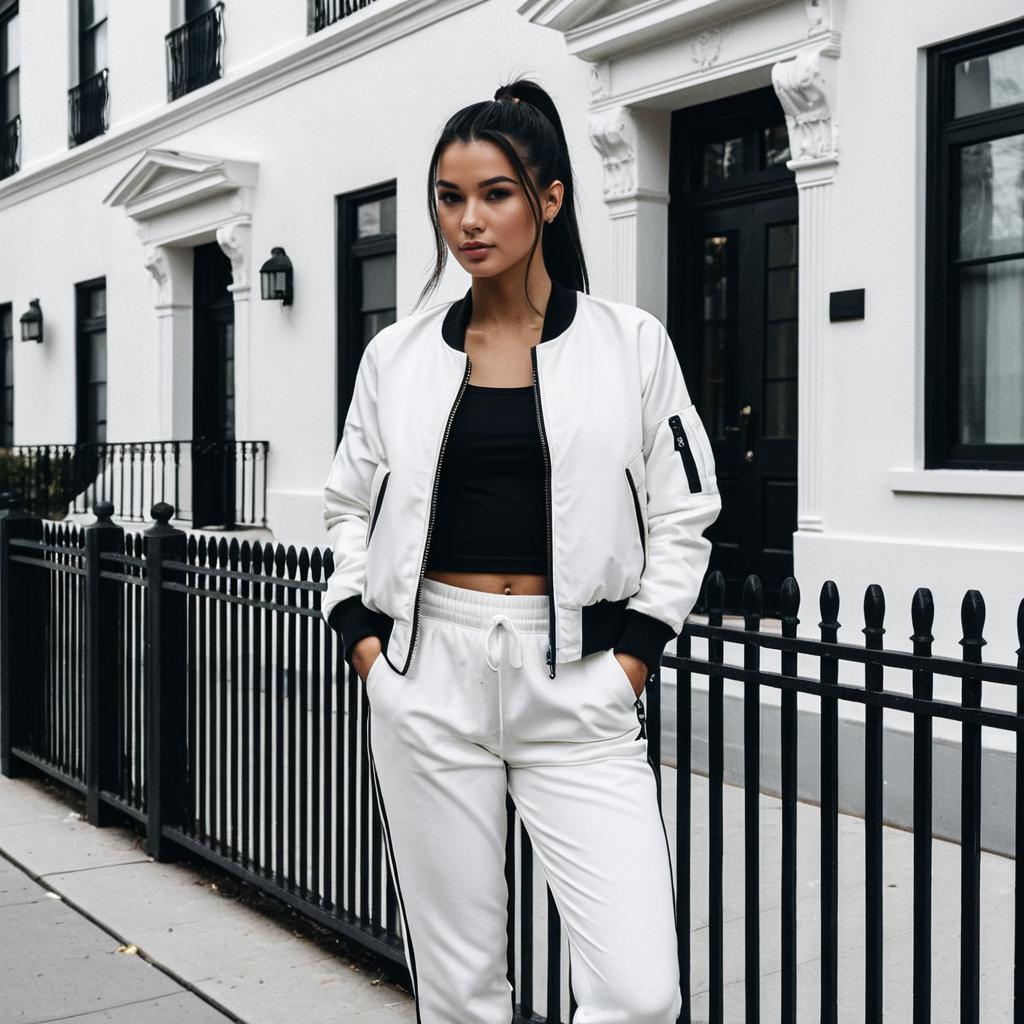 Photorealistic image of a young woman with straight dark hair styled in a high ponytail, standing confidently with hands in pockets. She is dressed in a monochromatic white activewear set, including a bomber jacket and matching pants with black accents. The urban setting features elegant white stucco townhouses with black wrought-iron railings and a paved sidewalk, captured in daylight.