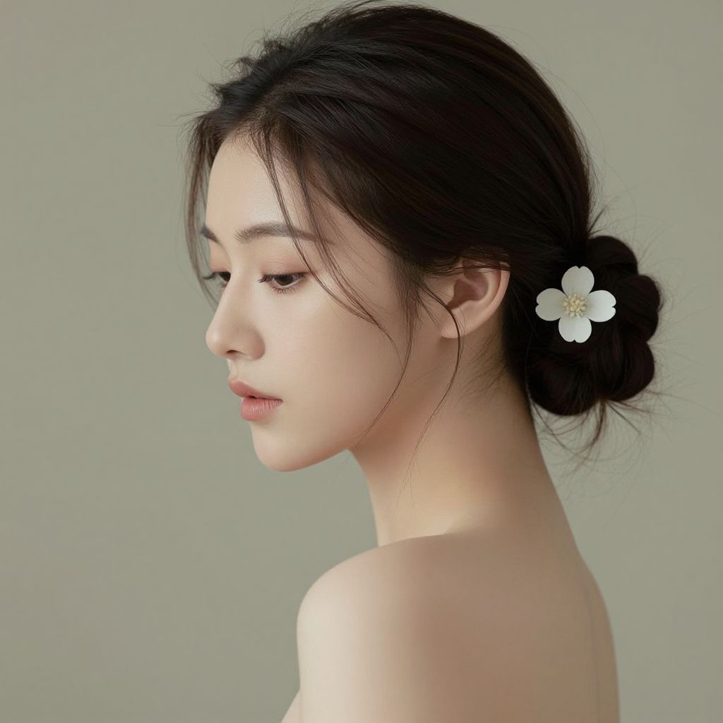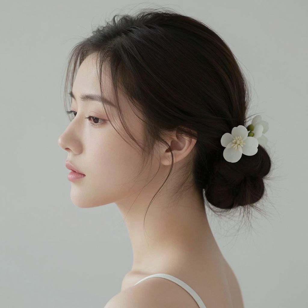 Photograph of an Asian woman with fair skin and delicate features, facing left. She has dark, slightly wavy hair tied in a low bun adorned with a single white flower. She wears a simple white spaghetti-strap top. Her expression is serene, with slightly parted lips and dark, almond-shaped eyes. The background is a smooth, light grey, creating a soft, minimalist contrast. The lighting is gentle, highlighting her smooth skin and the subtle texture of her hair. The overall composition is elegant and minimalistic, focusing on her natural beauty and the simplicity of the white flower accessory.
