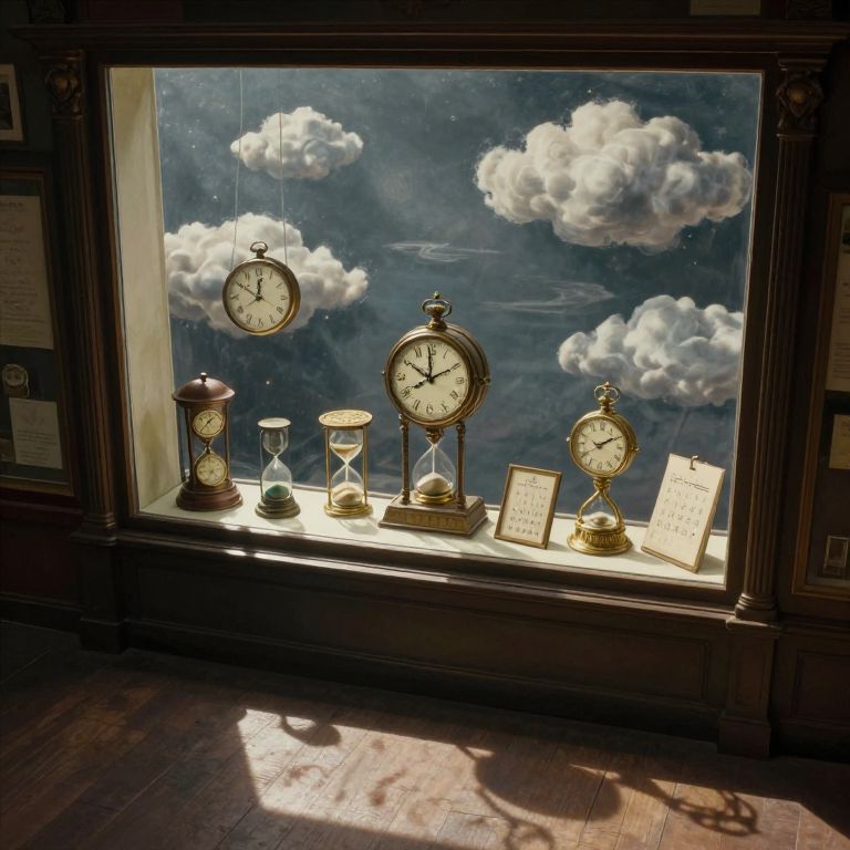In the whimsical style of surrealist art, depict an antique shop window from a high-angle perspective, where vintage timepieces are meticulously arranged on a glass shelf beneath a sky filled with cloud formations resembling various temporal objects - clocks, hourglasses, and calendars. The sunlight streaming through the window casts dramatic shadows across the shop floor, creating an intriguing interplay of light and shadow that invites viewers into this enigmatic scene. This image captures the essence of Magritte's works by exploring the nature of time itself through a surreal and atmospheric visual narrative.
