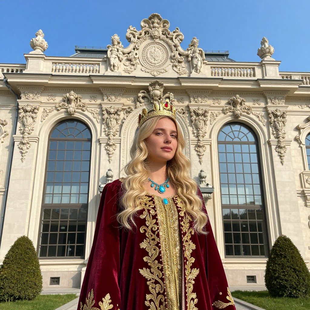 Photograph of a blonde woman with long, wavy hair standing in front of an ornate, baroque-style building. She's wearing a red velvet robe with gold embroidery, a gold crown, and a turquoise necklace. The building has intricate carvings, large arched windows, and a grand facade. The sky is clear and blue, and there are trimmed bushes in the foreground.