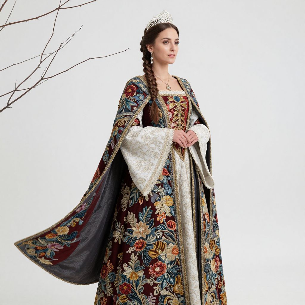 Photograph of a regal woman in a detailed, floral-patterned, medieval-style gown with a long, ornate cape, wearing a silver ti