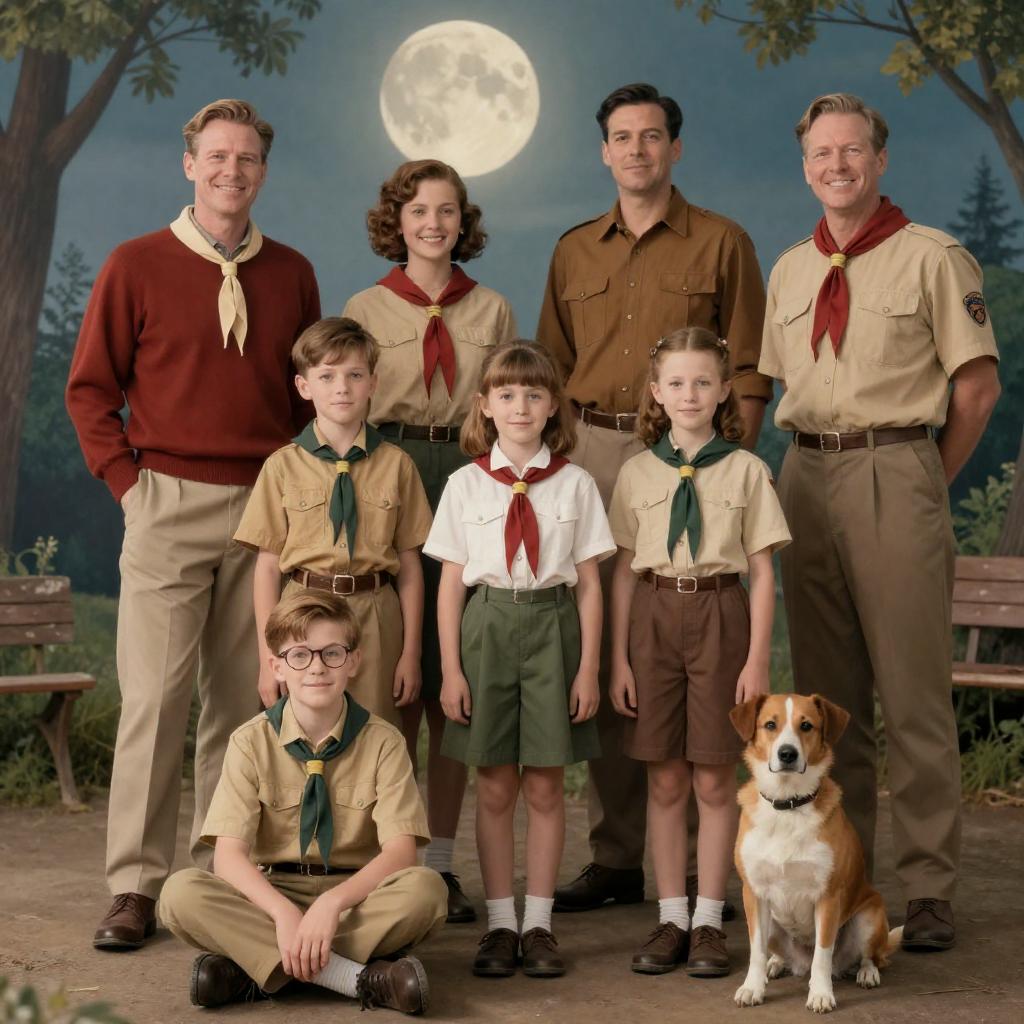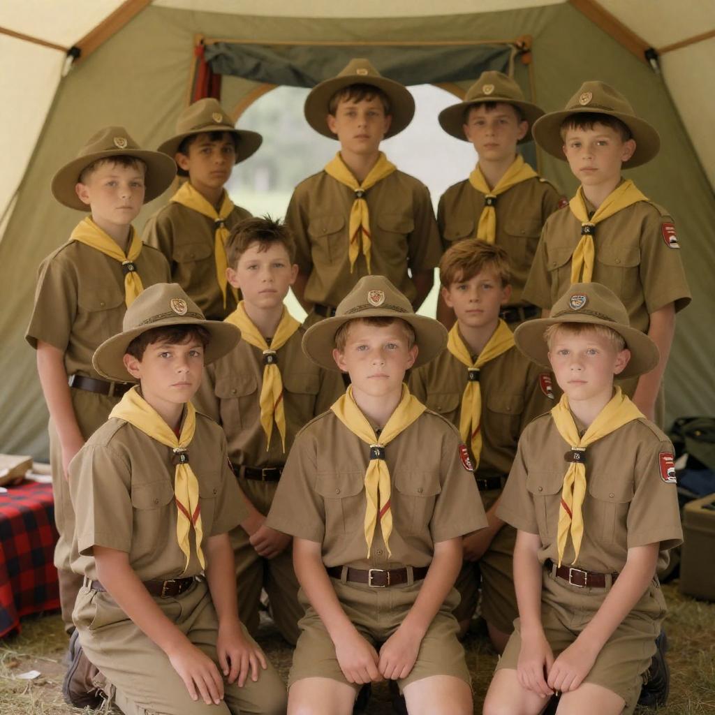 Boys in Scout Uniforms at Rustic Hut