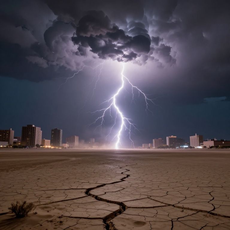 Photograph of a dramatic nighttime cityscape during a thunderstorm. A vivid, bright lightning bolt shoots vertically from a dark, cloudy sky, illuminating the scene with intense white light. The city's skyline features numerous high-rise buildings with some windows lit, creating a contrast against the dark sky. In the foreground, a cracked, dry, and barren desert-like landscape extends towards the city, with a dark, winding crack running through it. The lightning's bright light reflects off the clouds, enhancing their dark, ominous texture. The overall scene is striking and intense, highlighting the dramatic contrast between the natural and urban elements.