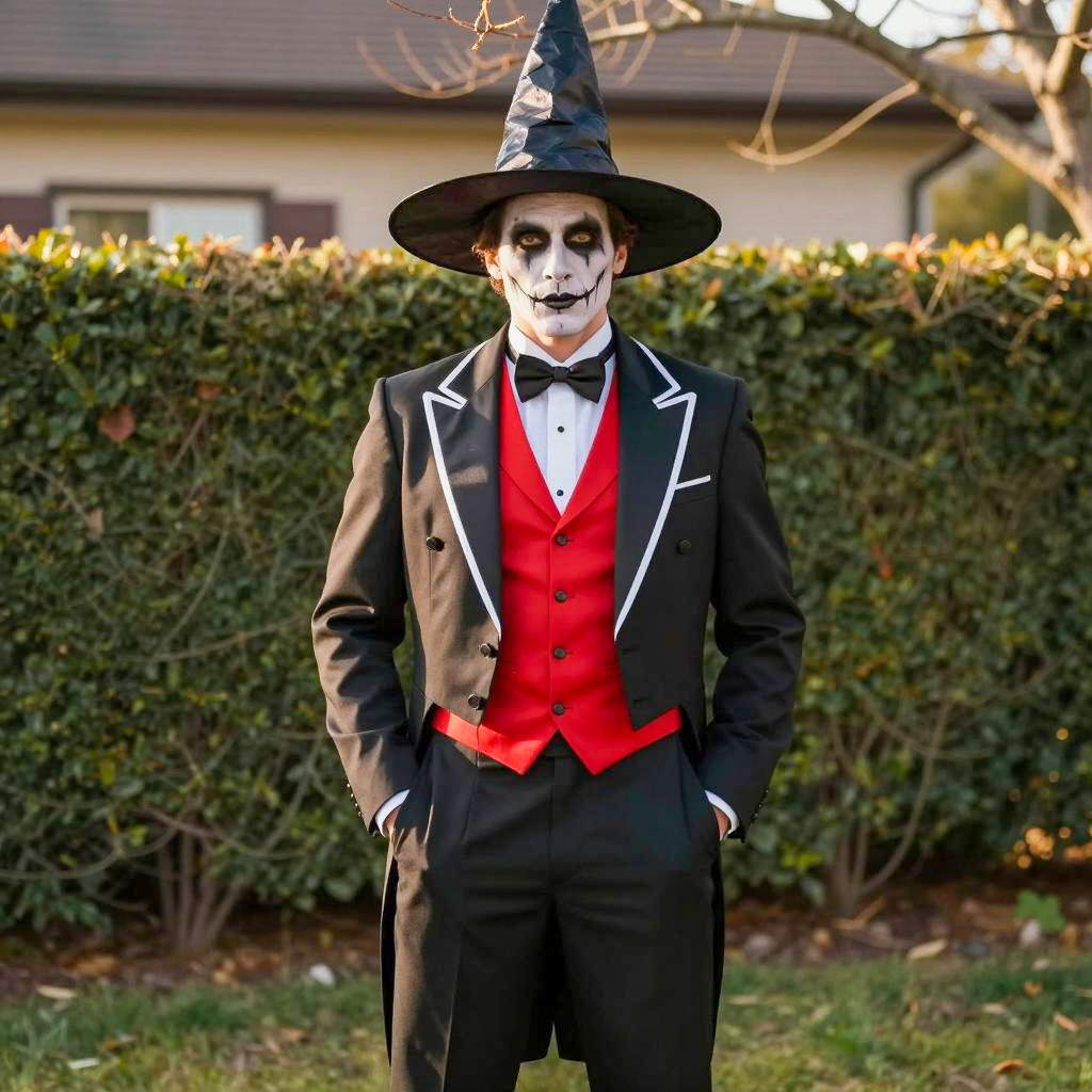 Deluxe man halloween costume, photograph of a man dressed as a witch, standing outdoors, late afternoon sunlight, wearing a black tuxedo with white piping, red vest, black bow tie, black pants, white shirt, black witch hat with pointed top, hands in pockets, pale face makeup with black stripes, bushy green hedge in background, blurred house in background, tree branches without leaves, grassy ground, warm light, realistic style