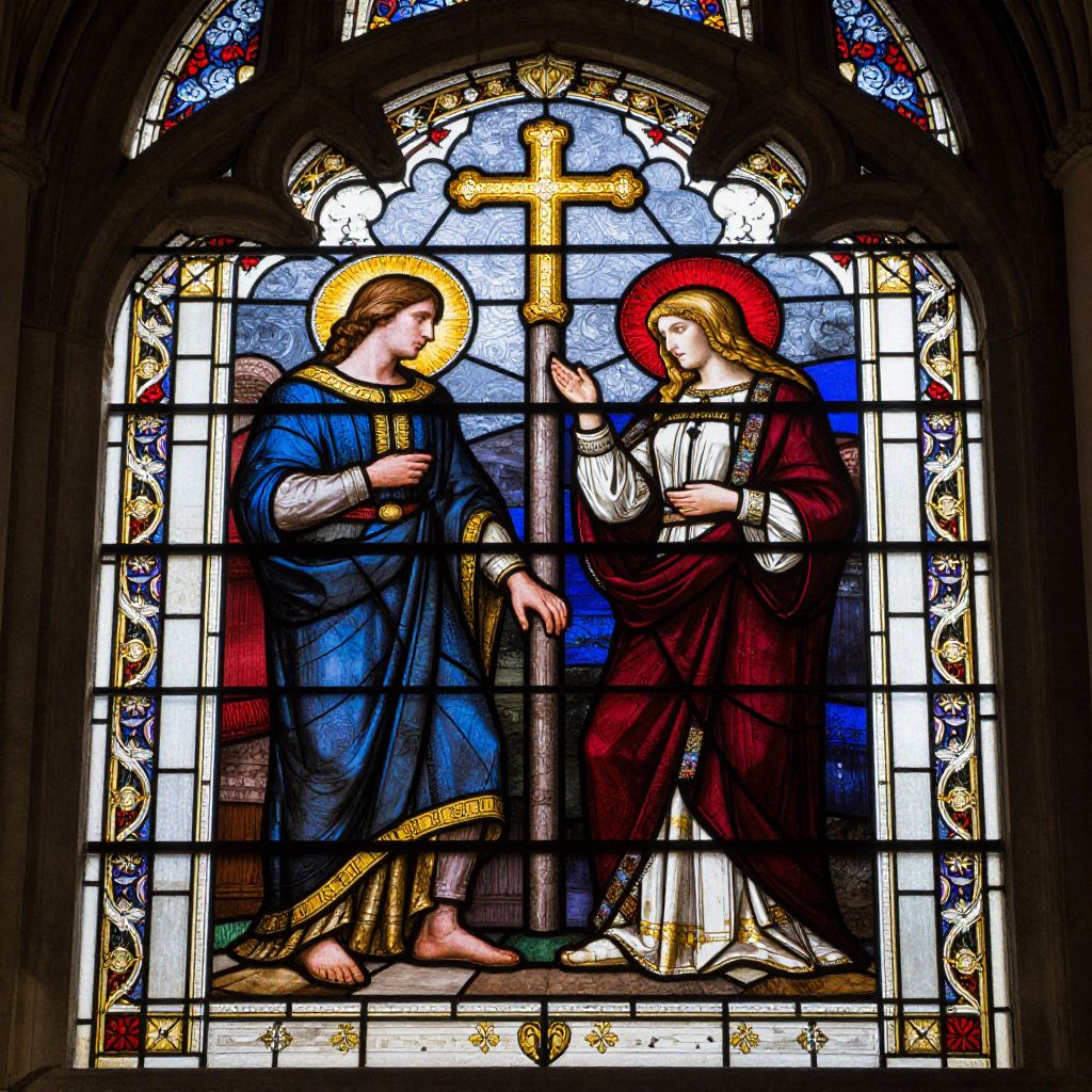 Stained-glass window in Manchester's Cathedral featuring two central figures—a man in blue and a woman in red—flanking a golden cross above, surrounded by intricate geometric patterns and floral motifs.
