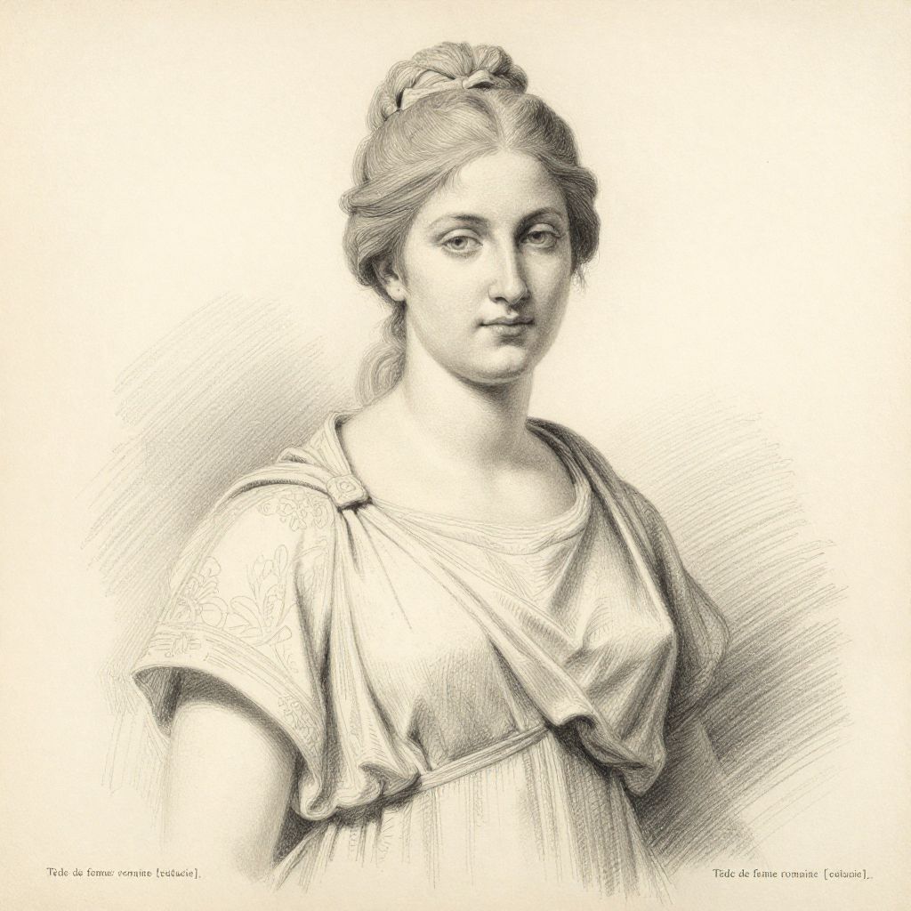 Elegant pencil sketch of a Roman woman by Adolphe-William Bouguereau (1825-1905), showcasing her classical hairstyle and draped attire, part of the Bargue-Gérôme Drawing Course II, titled \"Tête de femme romaine [étude],\" with whereabouts currently unknown.