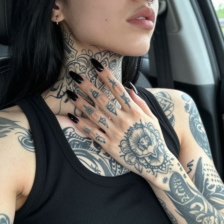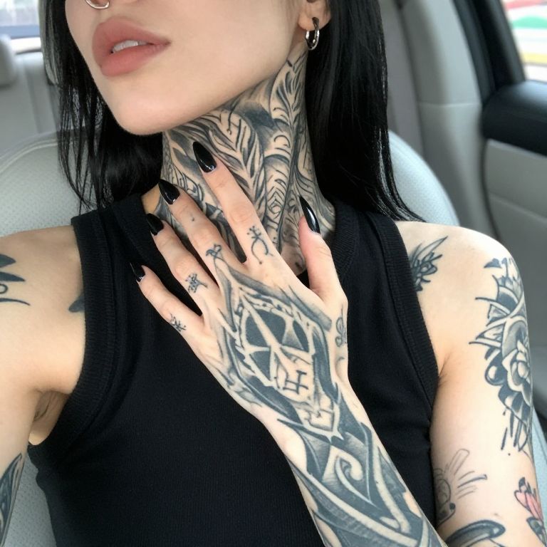 Photograph of a heavily tattooed person with long black hair, wearing a black sleeveless top, showing off intricate tattoos on their neck, shoulder, and hand. Their hand with long, sharp black nails is touching their neck. The person has a nose ring and is partially visible from the chin down. The background is a blurred car interior with white and grey seats.