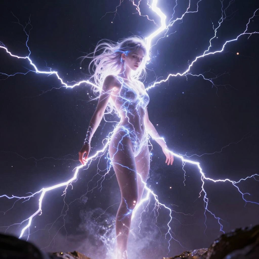 Highly detailed digital art of a female elemental being composed of lightning, surrounded by crackling electric energy particles. The figure has an ethereal appearance with bright flashes of light illuminating her form against a dark background, evoking a powerful and mystical atmosphere.